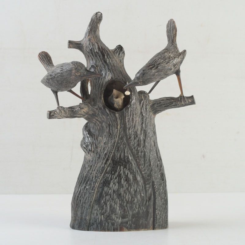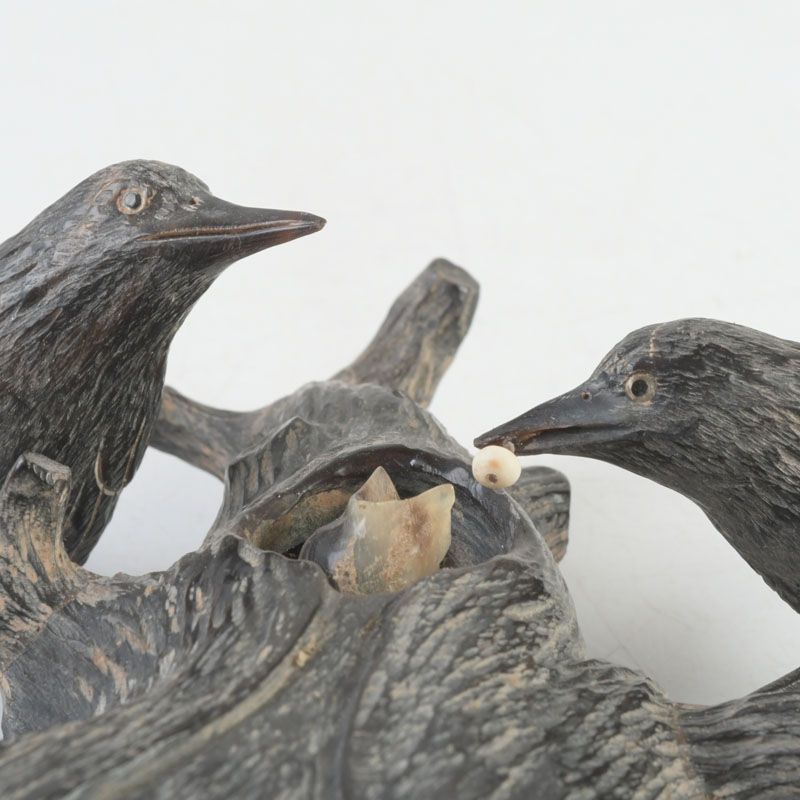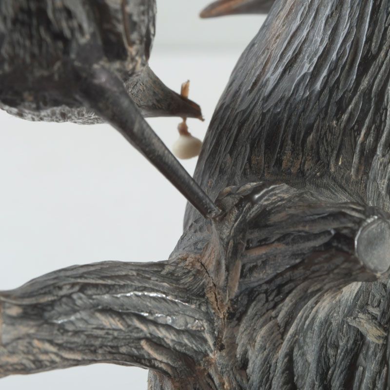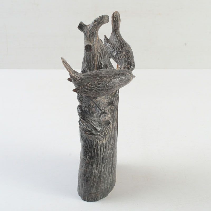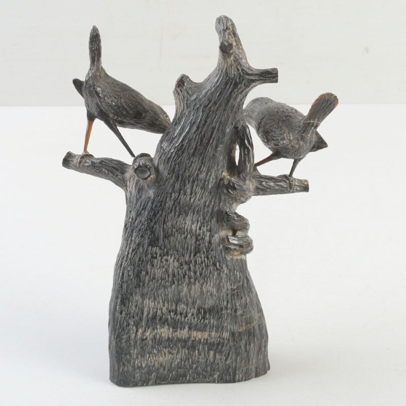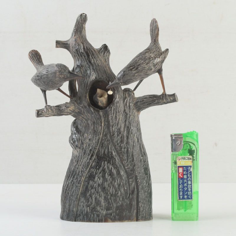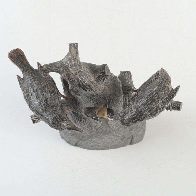 中国 水牛の角彫刻 木に鳥の親子 置物 N S239