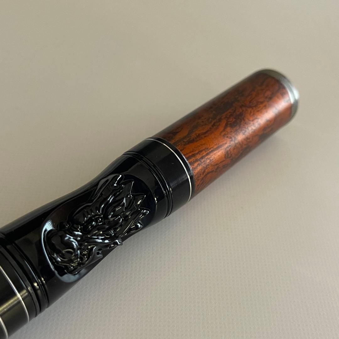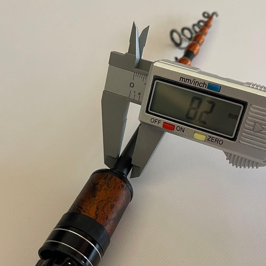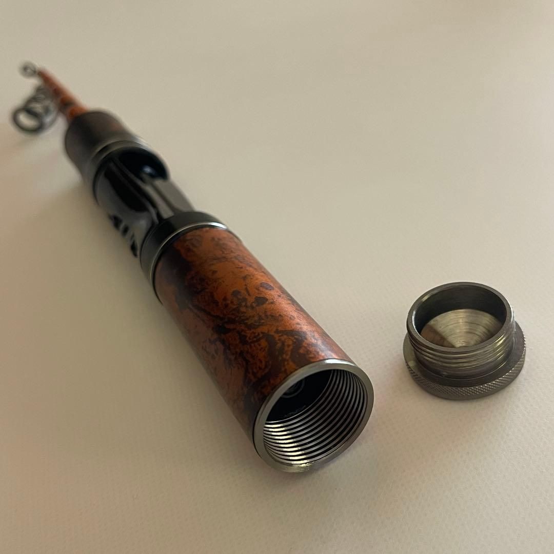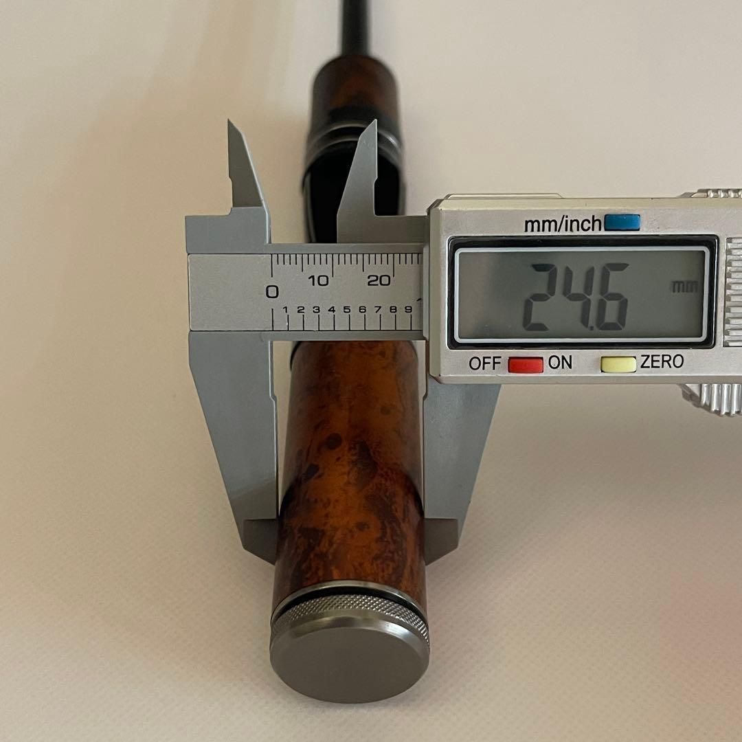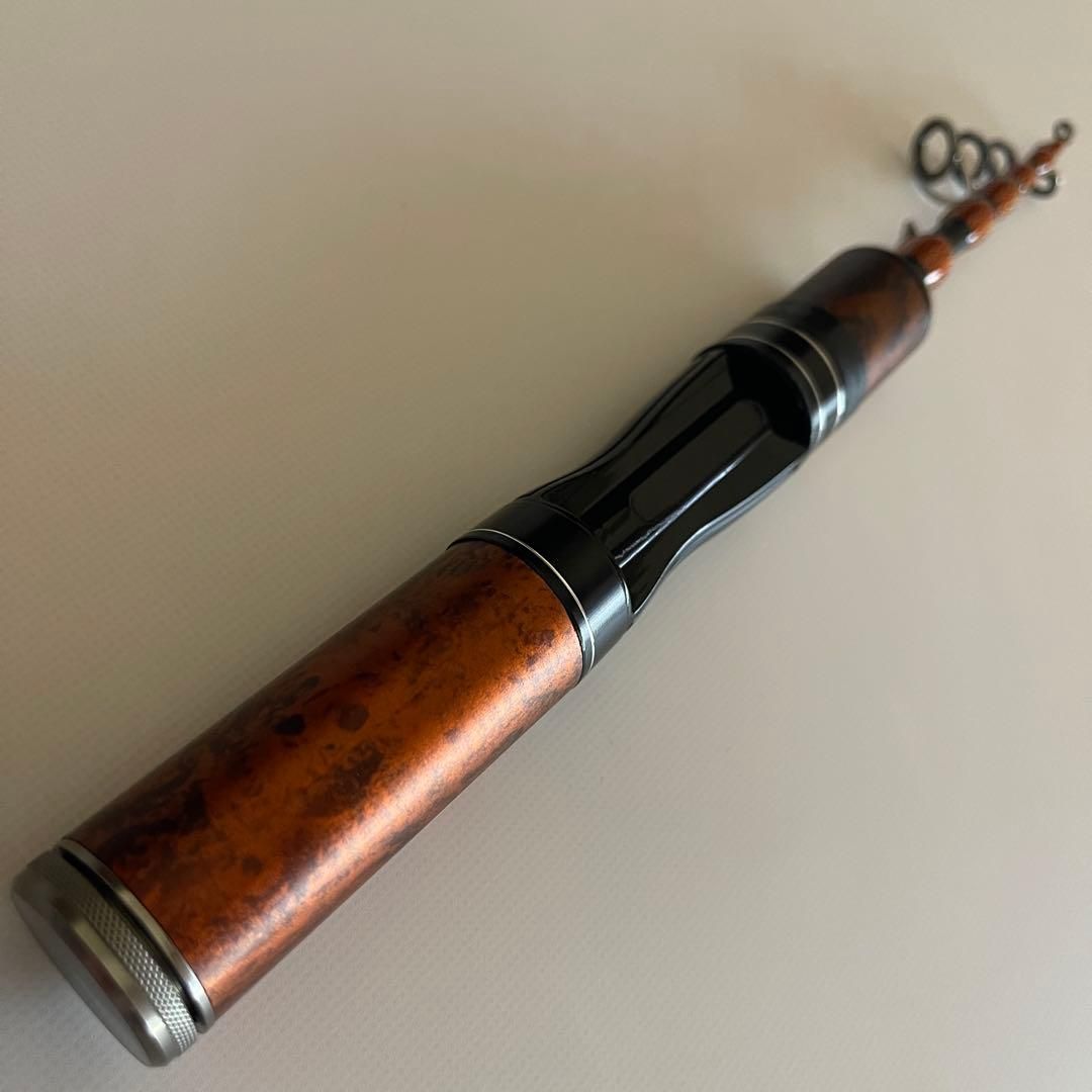 天然木のような質感を再現した木目調グリップと、金属リールシートの上質なコントラスト。