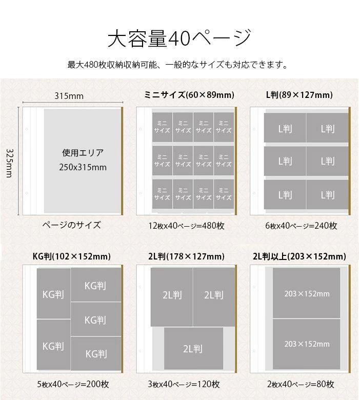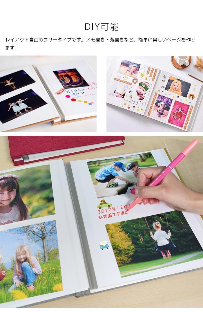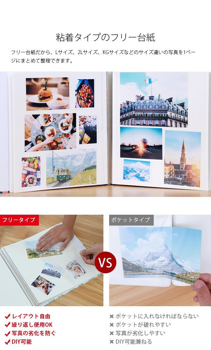 フリー台紙だから、Lサイズ、2Lサイズ、KGサイズなどのサイズ違いの写真を1ページにまとめて整理できます。グリッドなし、自由に写真を貼ります。
