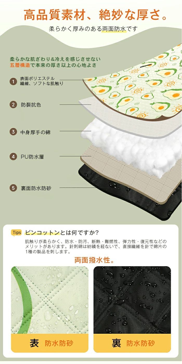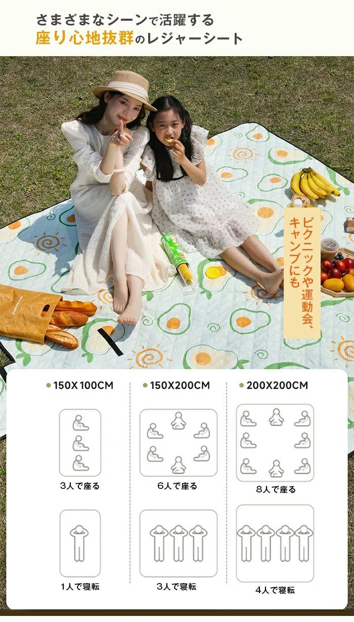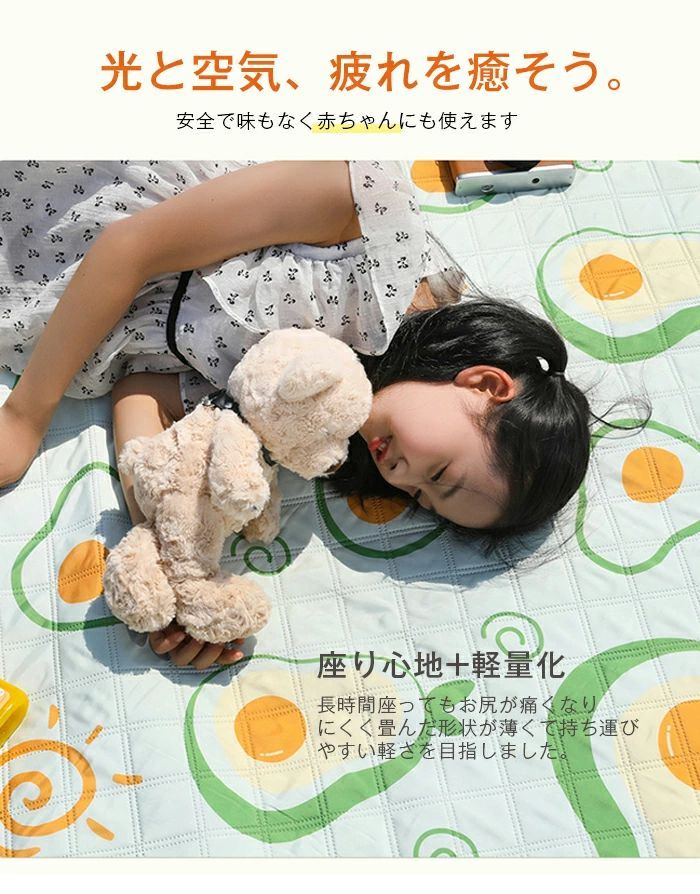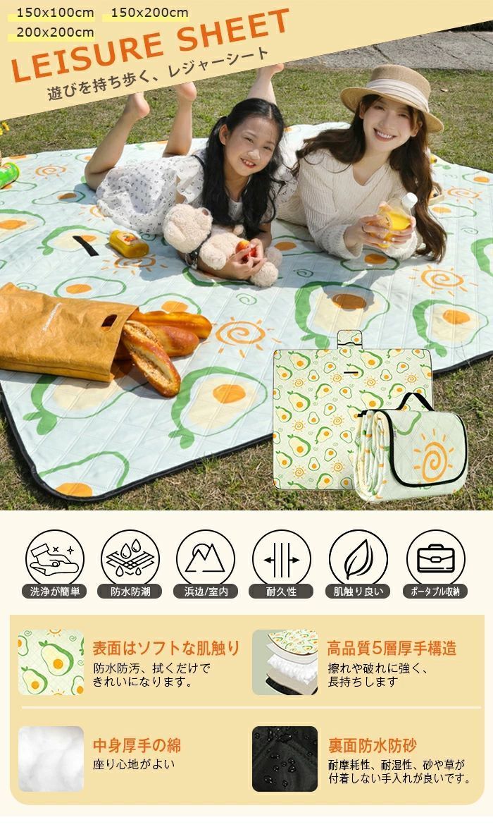 12色展開。サイズ:150cm*100cm/150cm*200cm/200cm*200cm。収納サイズ:約33cm*25cm*15cm。重量:0.8~1.9kg 素材:表地紬素材/中地スポンジ/裏地オックスフォード素材。5層構造で作られた高品質なレジャーシートが柔らかくてちょうどいい厚さで重くなく持ち運びやすいです。長時間座ってもお尻が痛くなく、快適な座り心地を提供します。アウトドアレジャーシート - 厚手で防水、快適なピクニックやアウトドアに最適。