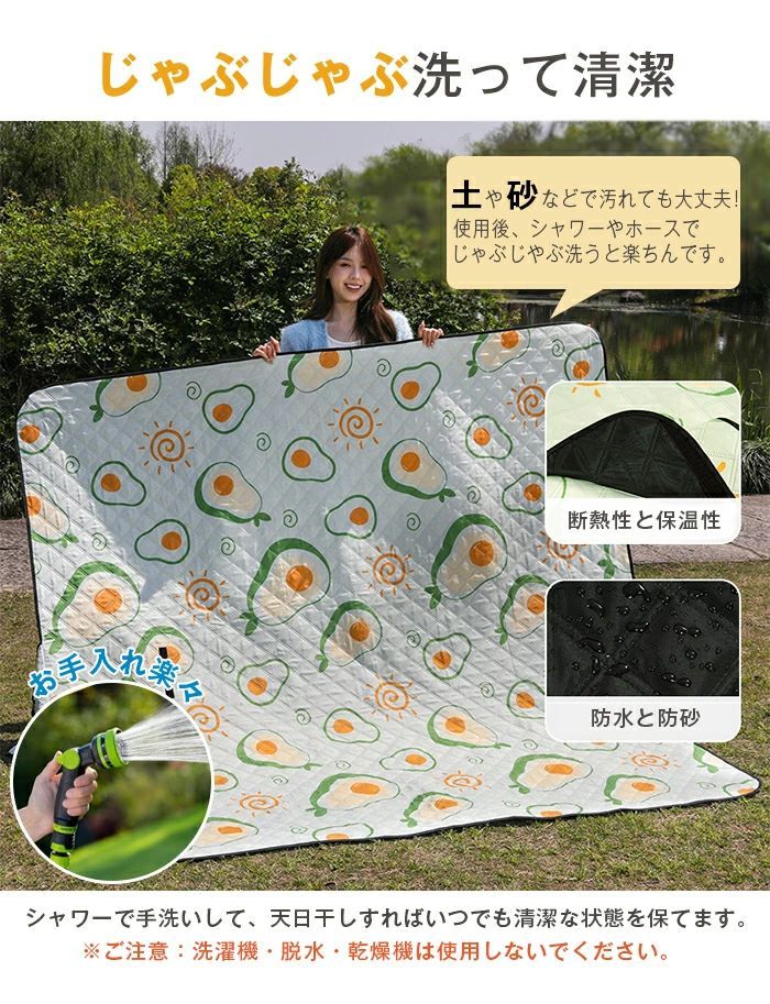 水や汚れに強く、通気性が良いので快適な使用が可能。洗濯&水洗いOK。手入れが簡単で、洗濯や水洗いも問題なし。アウトドアレジャーシートは、アクティブなライフスタイルを楽しむ方におすすめのアウトドアアイテムです。快適な座り心地で、様々なイベントをより楽しく演出します。