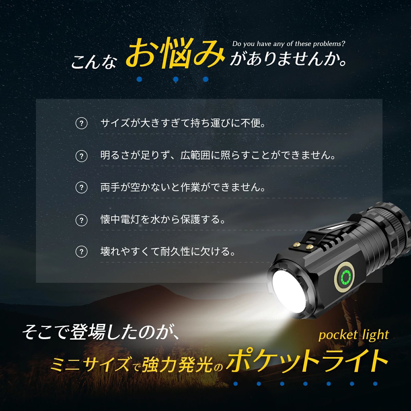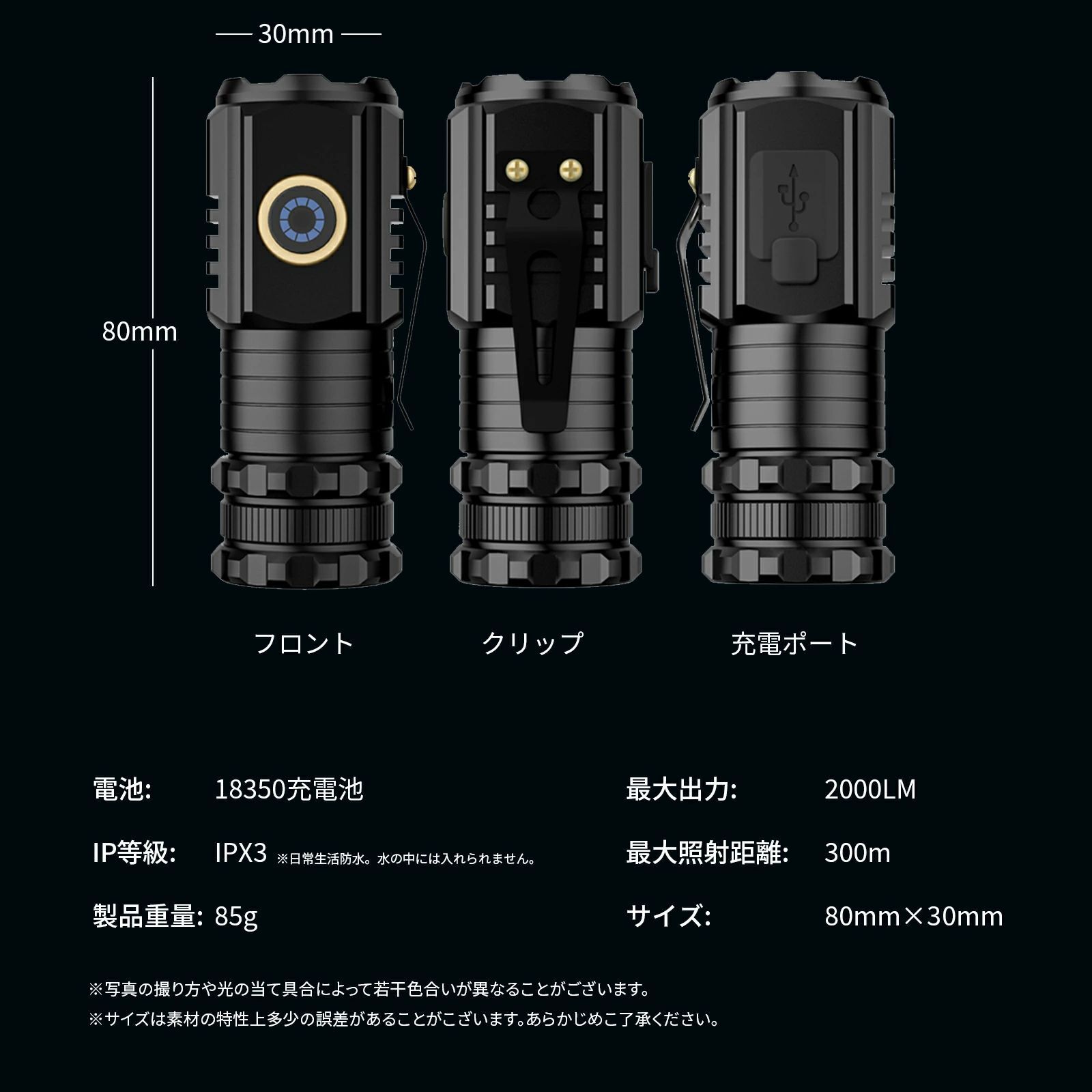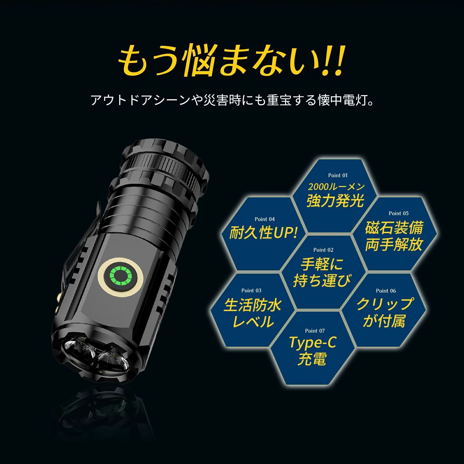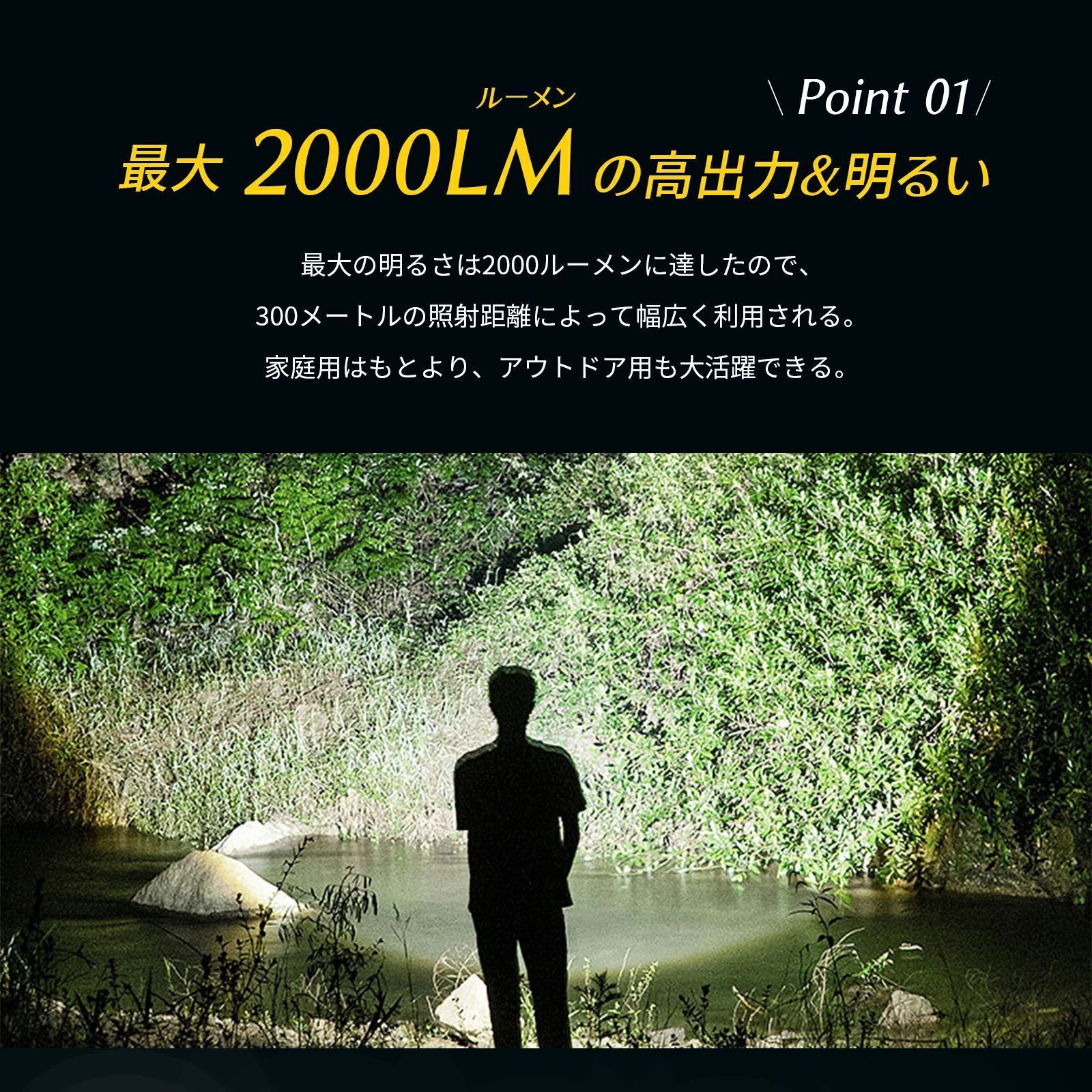 パワフルな充電ができるミニLED懐中電灯です。 TIR光学レンズを搭載し、柔らかくバランスを生かした光束です。 4モード、2000ルーメン(最大)出力は極めて明るい、最大217mの光束を生み、1500mAhの大きいバッテリー容量とUSB Type-C充電が可能。