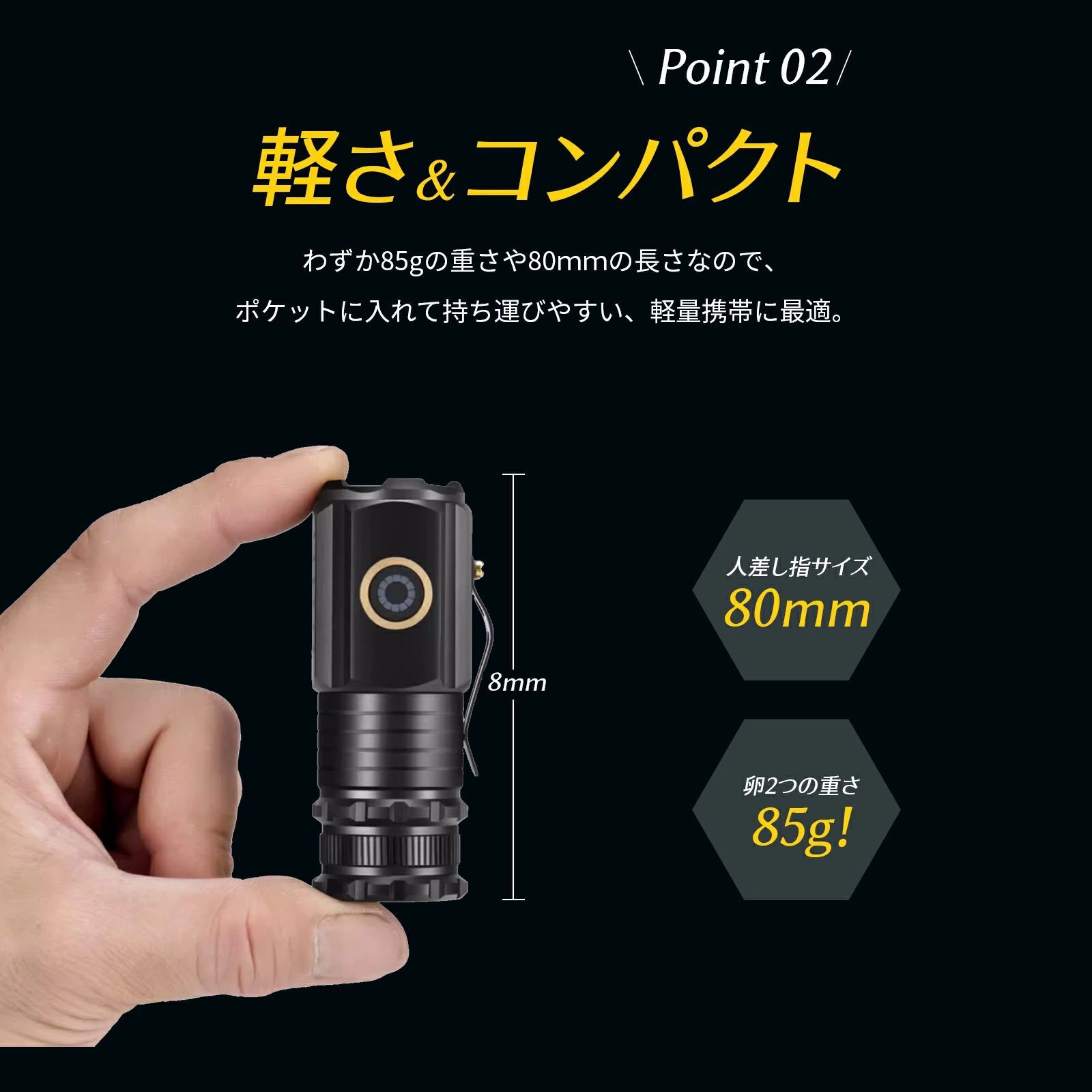 このLED懐中電灯は10.1cmの長さで、頭の直径は2.47cm、非常にコンパクトで、重さはわずか55gです。 便利なポケットクリップ付き、ポケット、シャツ、どんなポケットにもポケットが付いています。