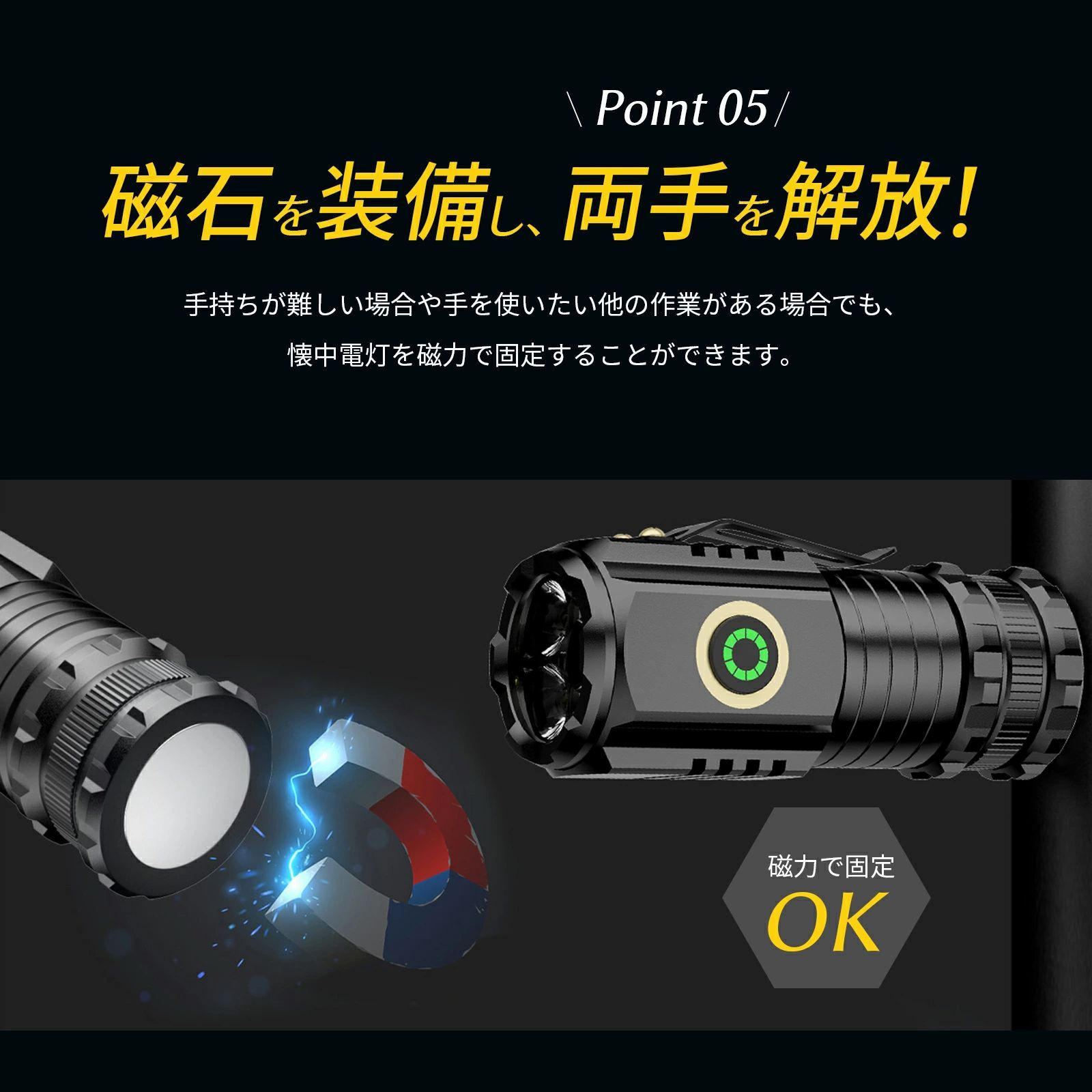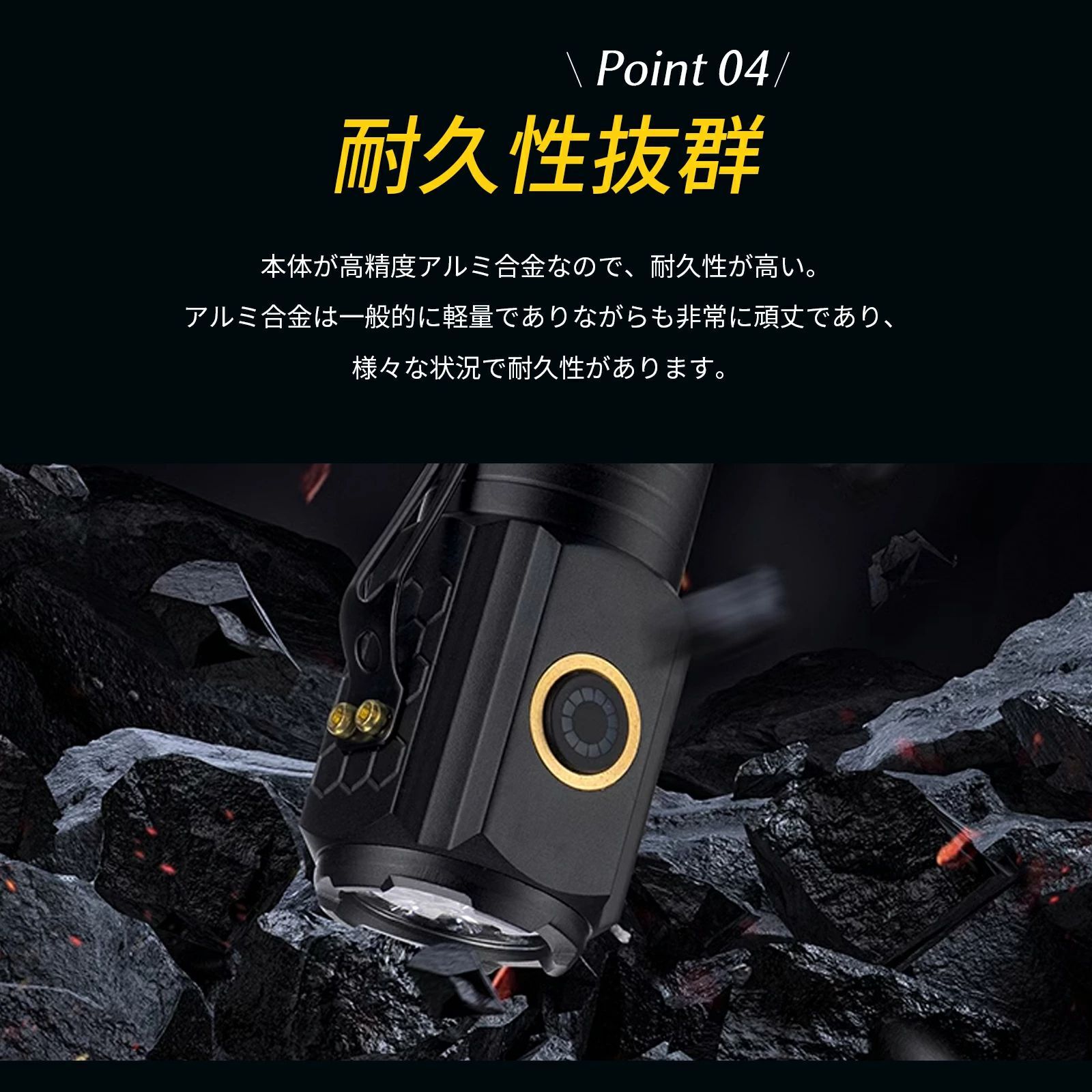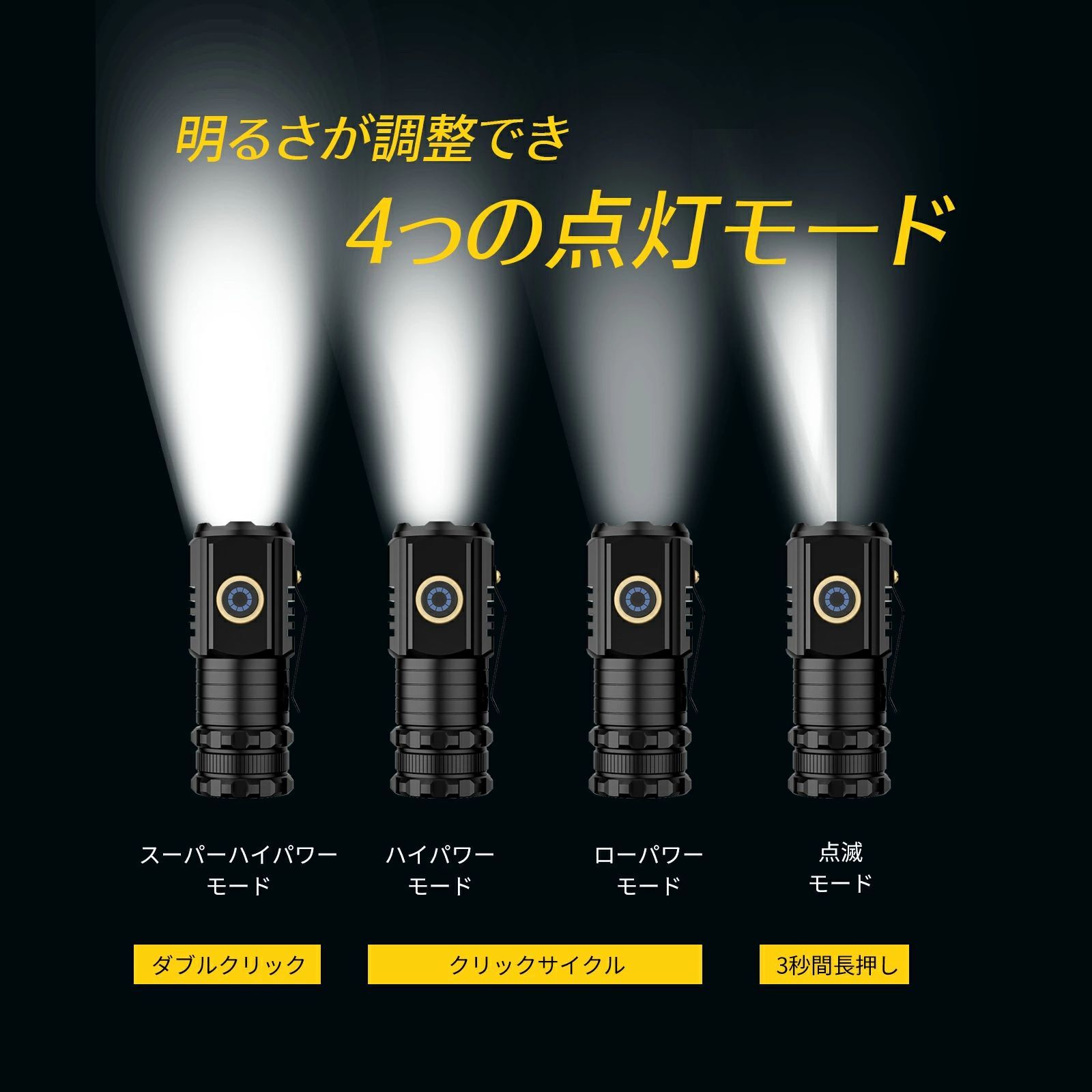 小型懐中電灯は、4つの異なる電灯モードを持ち、あらゆる状況に対応できます。それに加えて、非常にコンパクトで持ち運びが便利です。このライトはアルミニウム合金で作られているため、非常に丈夫で耐久性があります。