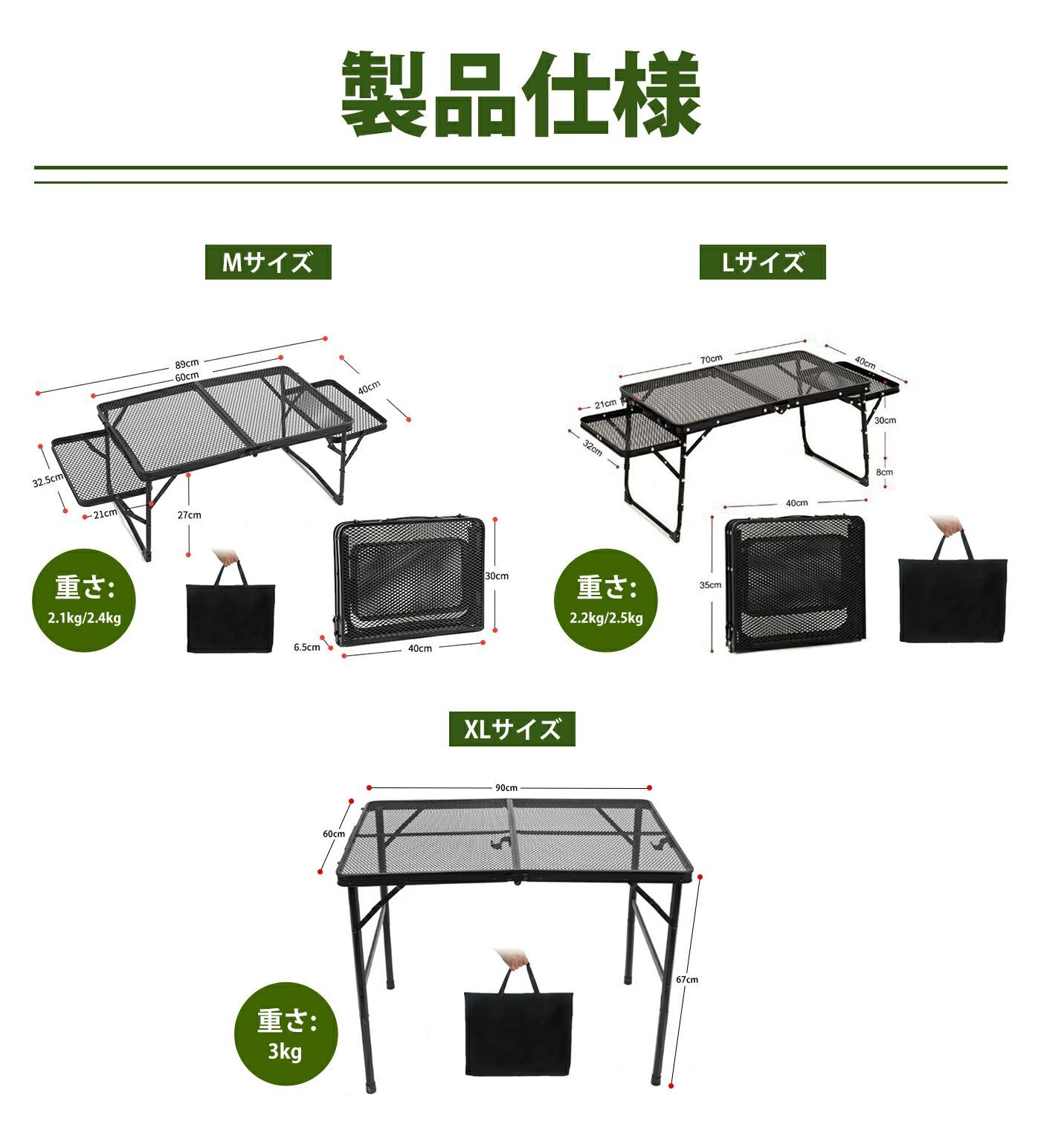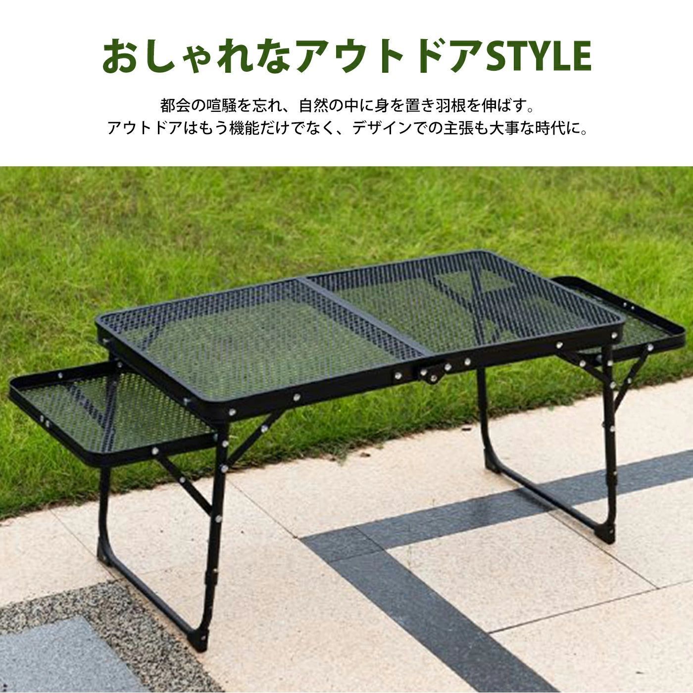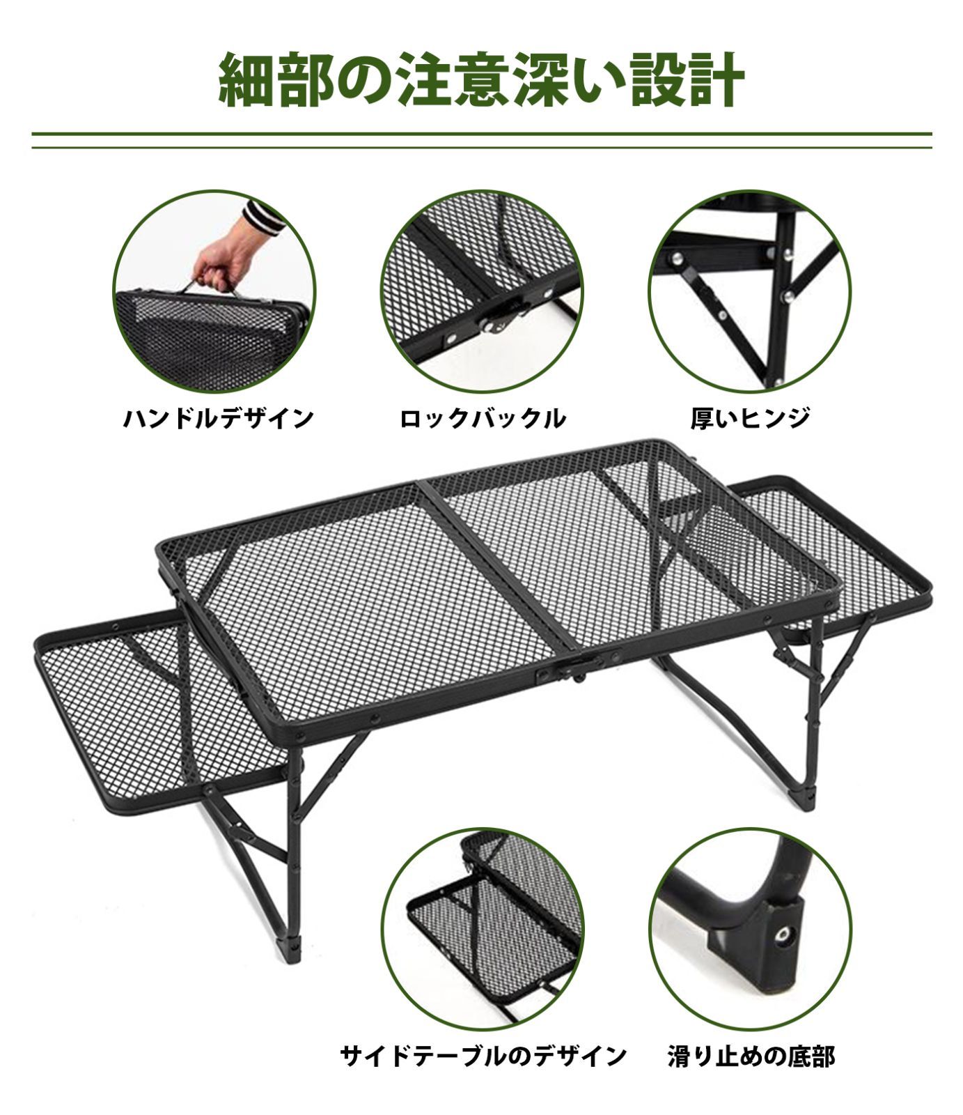 従来のキャンプテーブルと比較して、両側に2つの小さなテーブルボードを追加してスペースを増やし。キャンピングテーブルは、アルミ合金製ブラケットと金網で作られ、軽量で耐久性が高い。キャンピングテーブルは黒い塗料で塗装され、軽さと耐久性を保ちながら、見た目の美しさも保証されている。