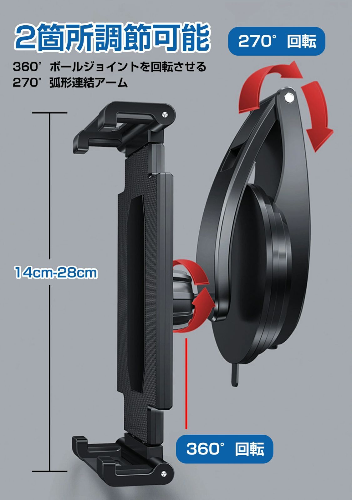 360度回転できるボールジョイントと回転可能の伸縮アームで、もっと幅広い可動域を届けます。 横でも縦でもスマホを自由に操作できます、両方使える動画鑑賞やナビゲートも見やすい。最適な視野角を得るためにアームが最大約18cmまで伸縮可能に改良されて、アームの角度270°自由に変更可能、反転ができ、設置場所によって角度調整可能し、運転席までの距離も短くなり、スマホを操作しやすく、超広範囲の可動範囲で、すべての車種に応じできます。