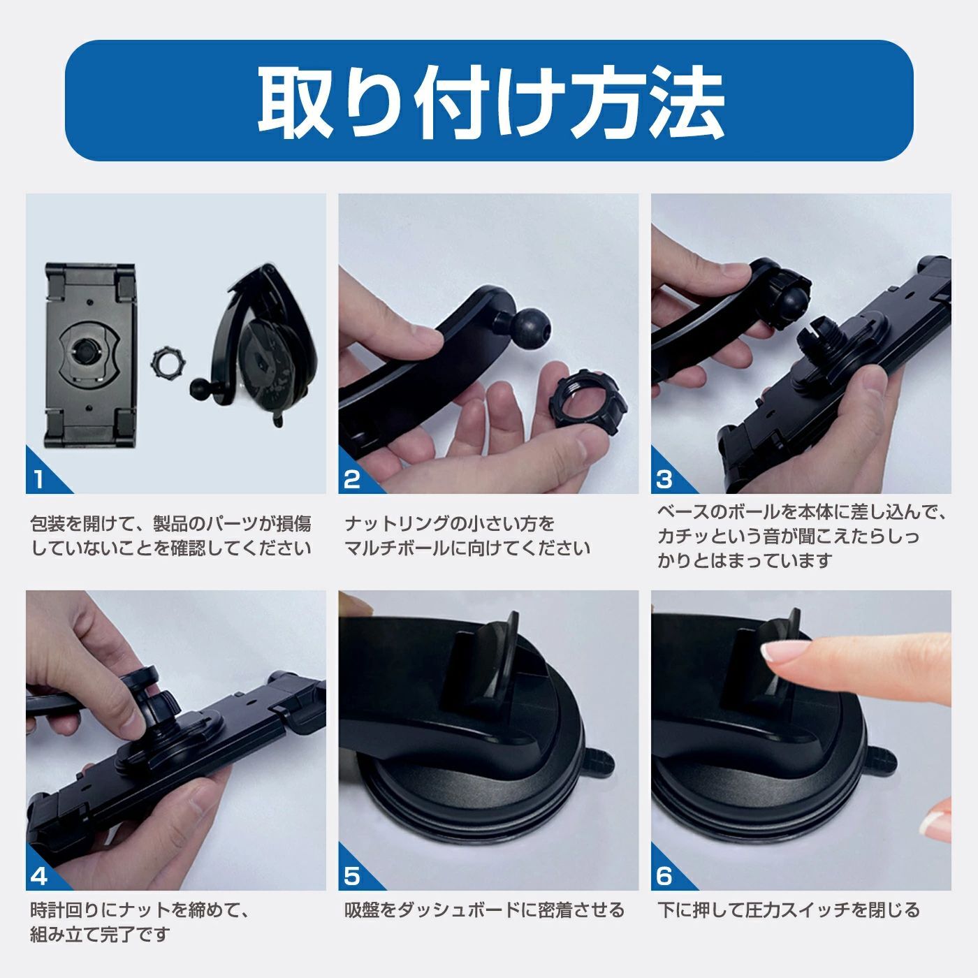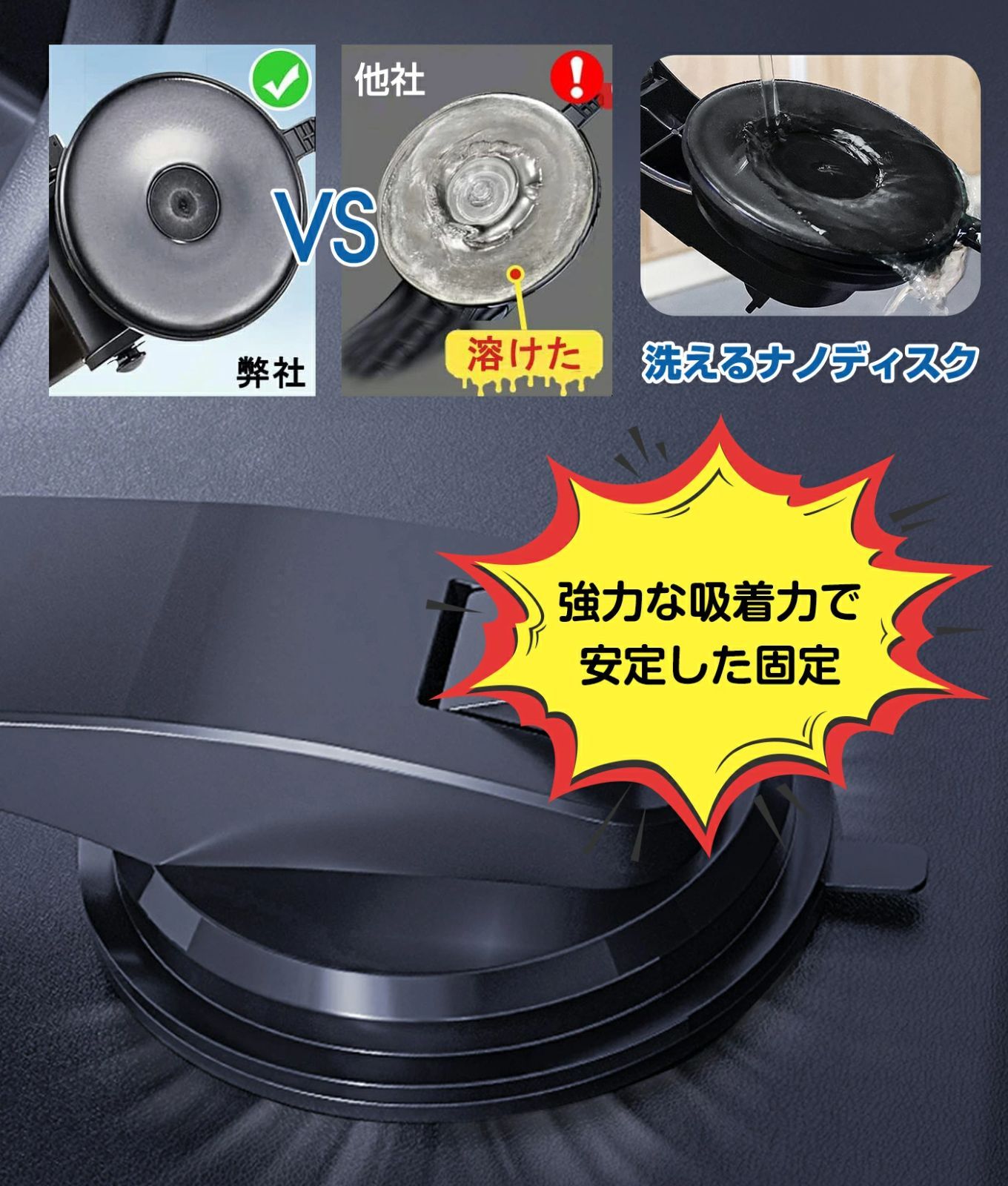この車載ホルダーは最新の真空吸着技術を採用し、吸着力が強くて安定性に優れています。高品質の素材で作られ、耐高温で耐久性が抜群です。 粘着パッドを使用すると、吸盤式車載ホルダーは吸盤パッドに取り付けて使用すると、スマホホルダーの安定性が大幅に向上し、従来型のフック式や3段クリップ式と比べて、クリップの先は平らではなく噛み込む様に改良され(ワニの歯のように)、スマホを緩まずがっちり固定できまして、どんな道でも絶対に落ちません。