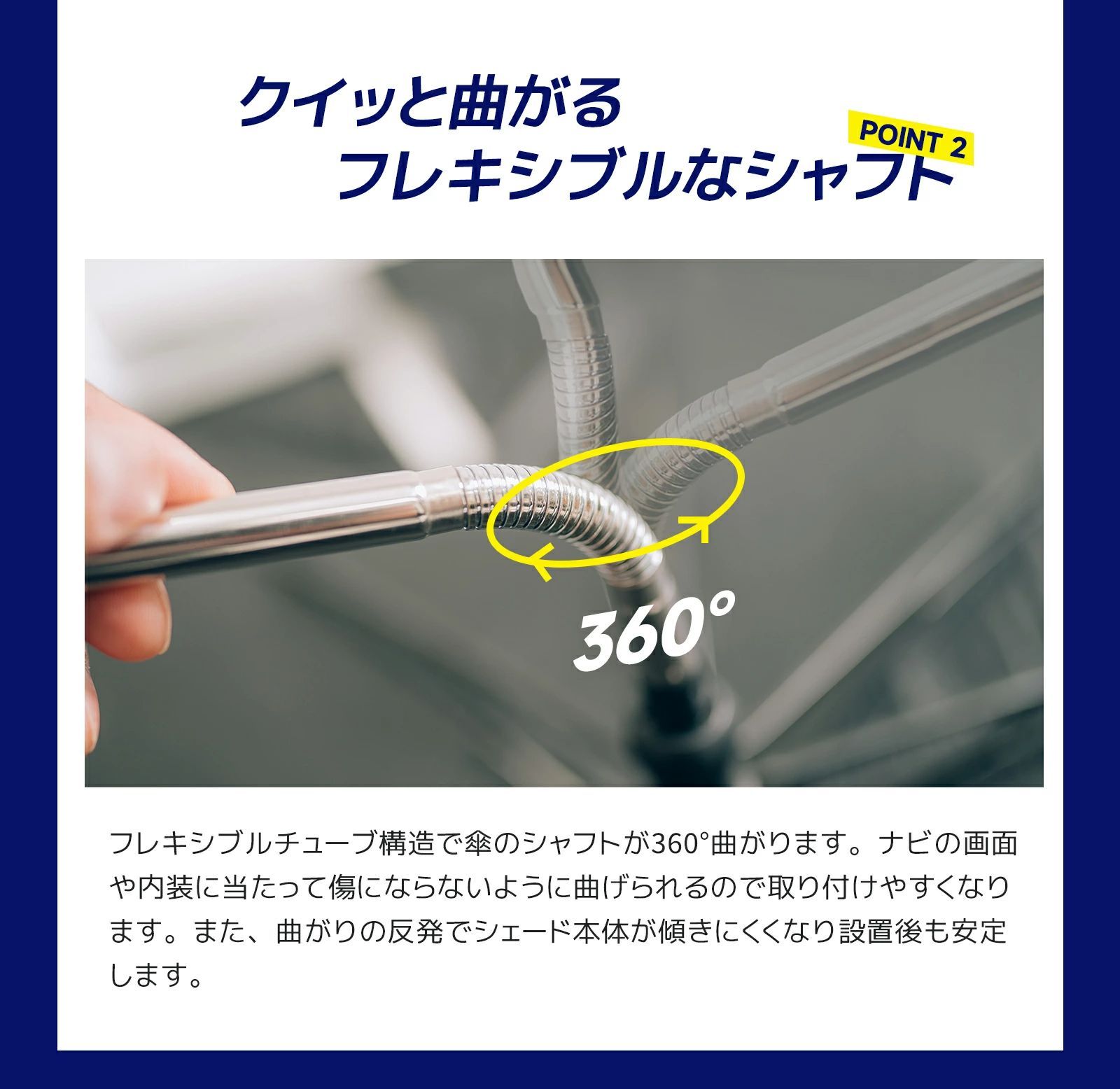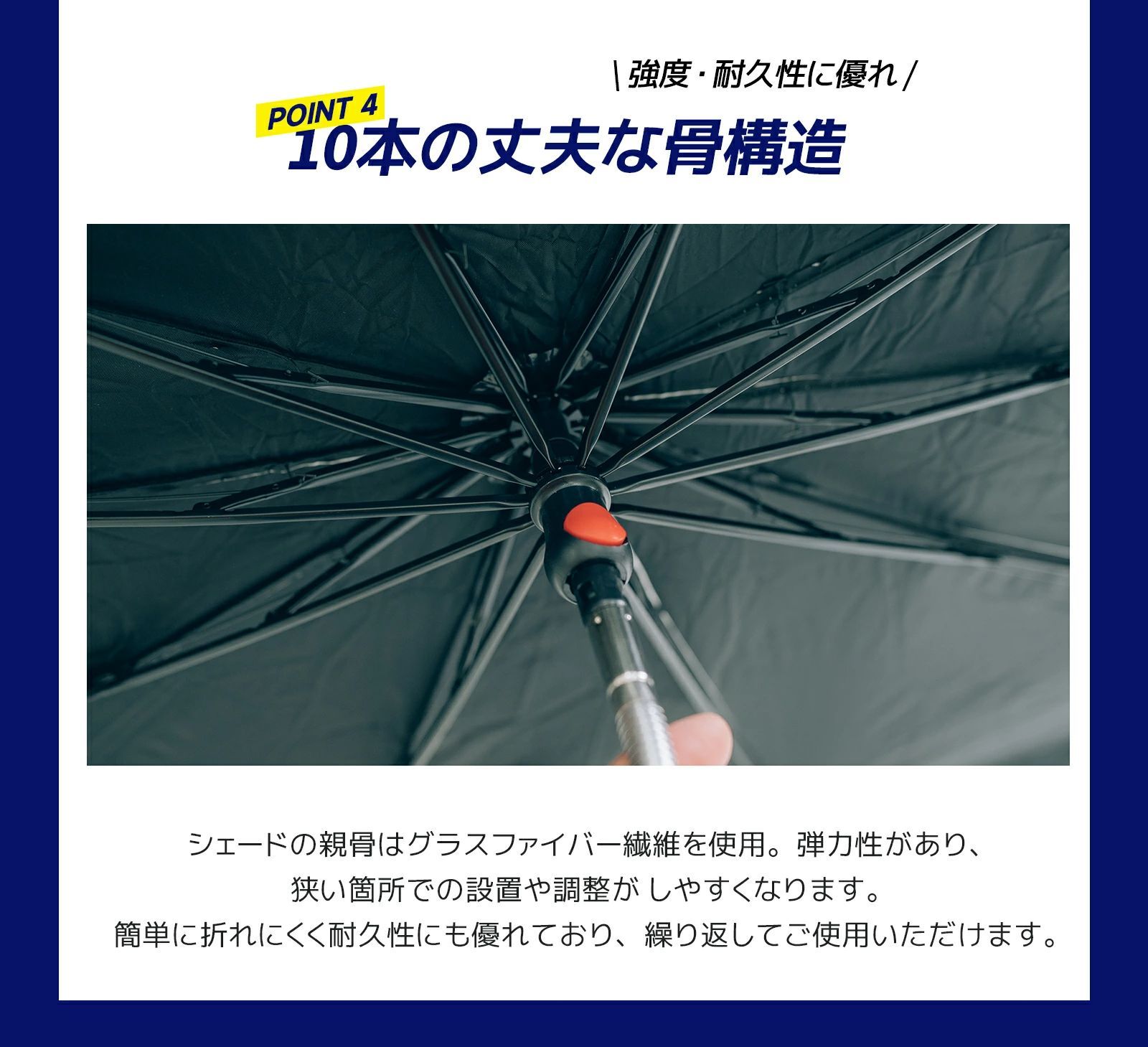 骨組みには、頑丈な黒鋼骨製の10本の傘骨を使っているから、吸盤や接着剤のサンシェードよりも、ずっと長持ちするんです。