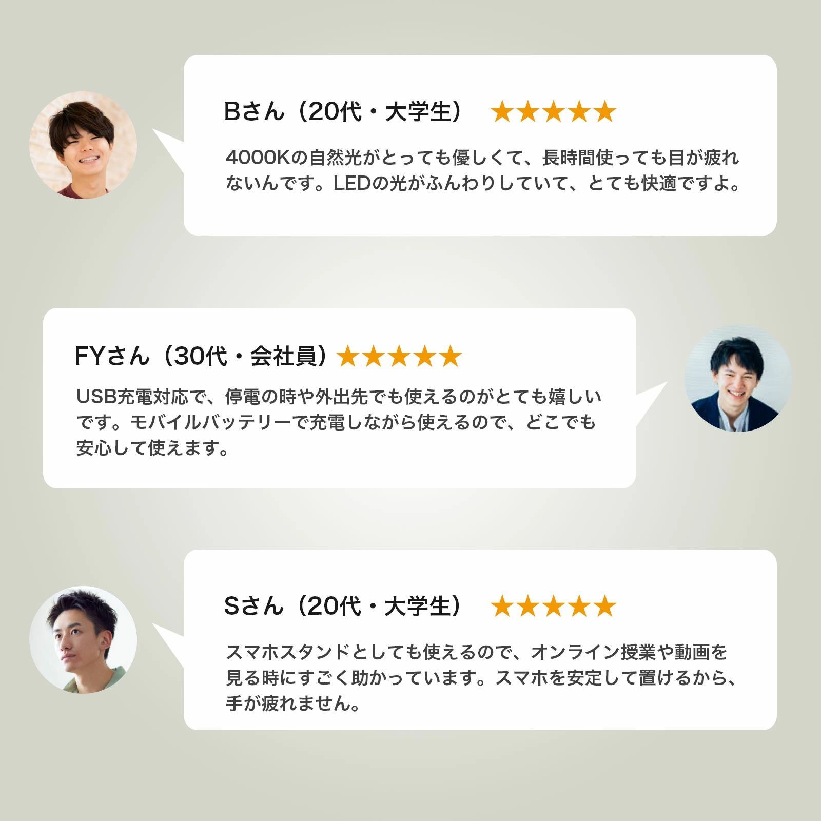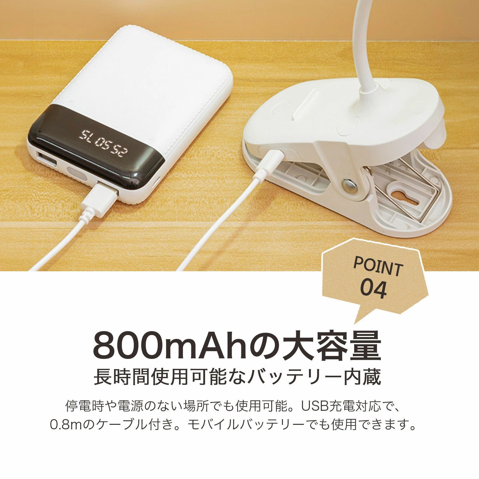 800mAhの大容量リチウムバッテリーを内蔵し、停電時や電源のない場所でも使用可能です。USB充電に対応し