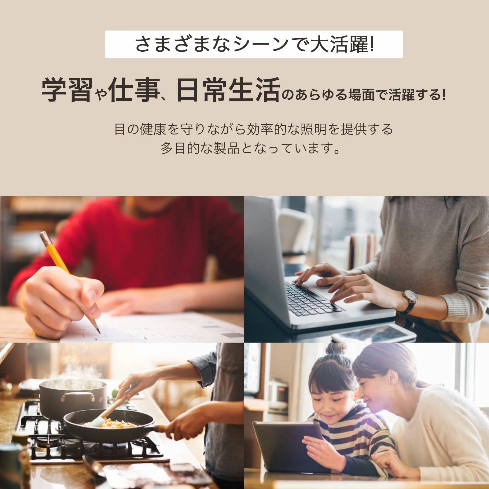 学生や会社員向けに特別設計されたこのデスクライトは、クリップ式と置き型の両方に対応しています。360度回転可能な柔軟なアームにより、あらゆる角度から理想的な照明を実現します。また、スマートフォンやタブレットのスタンドとしても使用でき、オンライン授業や動画視聴に便利です。