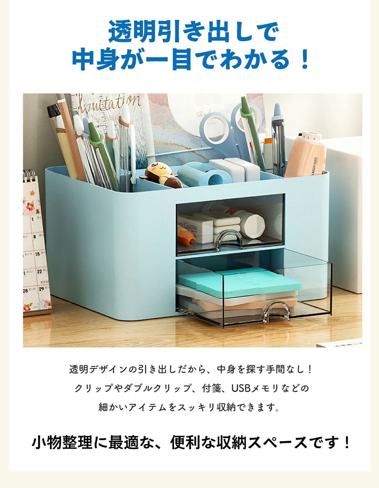 2段の透明引き出し付きで、収納したアイテムがすぐ見つかる!クリップやUSBメモリ、付箋などの小物をスムーズに整理できます。