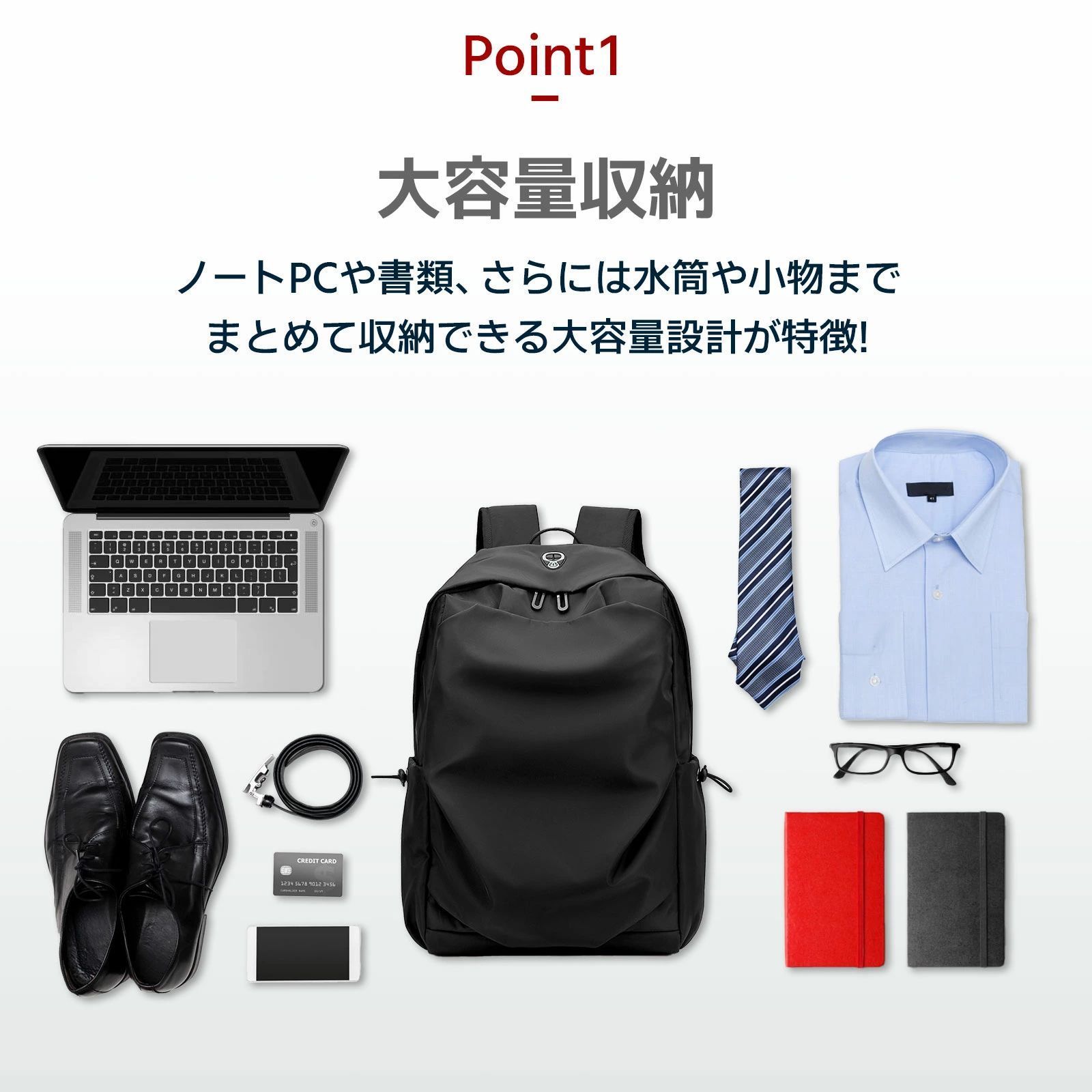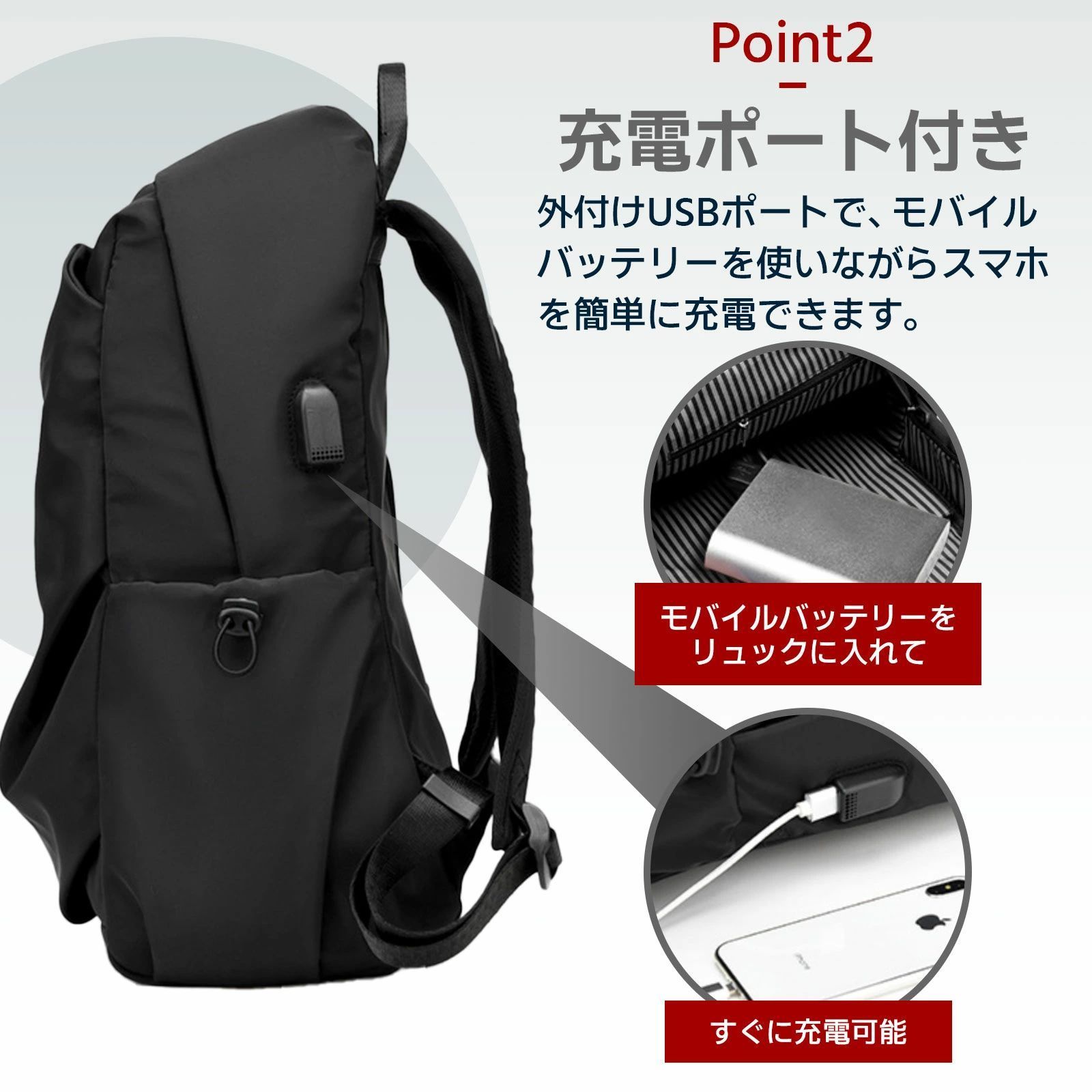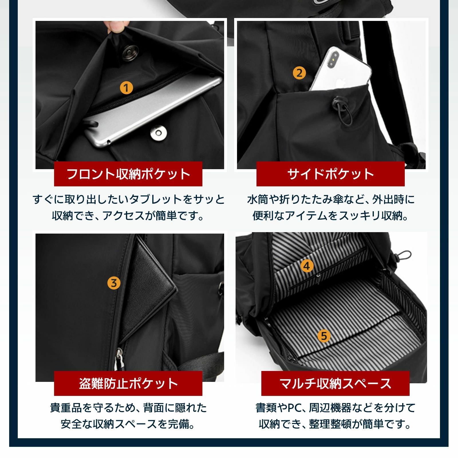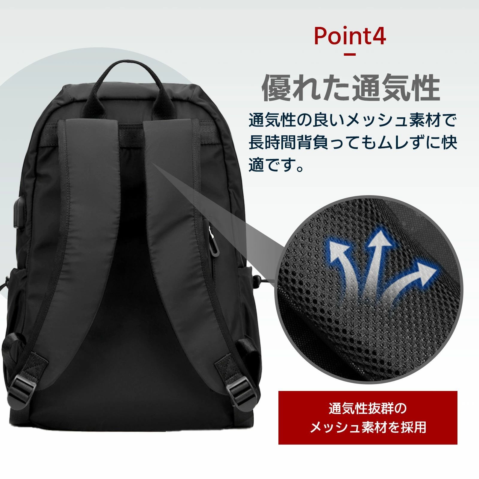 軽量設計ながら、驚くほどの収納力を誇ります。A4サイズの書類はもちろん、ノートPC、分厚い教科書、折りたたみ傘、着替え、ペットボトル、お弁当箱など、日常生活に必要なあらゆるアイテムを余裕で収納。重量物を入れても、背負い心地の良さは変わりません。通勤、通学、旅行、出張など、様々なシーンで活躍します。さらに、サイドに搭載されたUSB充電ポートにより、移動中でもスマートフォンの充電が可能。急な電池切れの心配もありません。