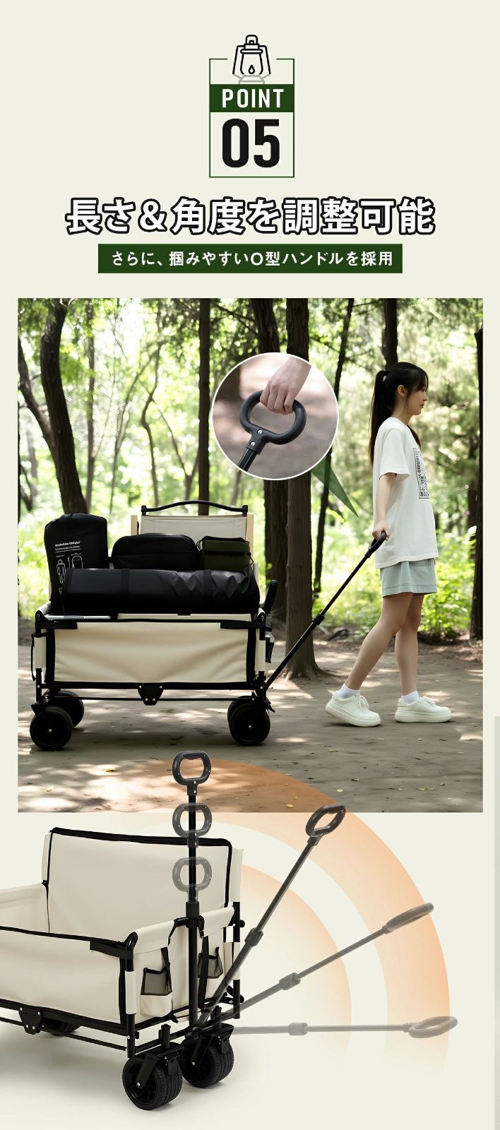 握りやすいO型ハンドル採用。長さと角度を自由に調整でき、誰でもラクに操作できます。