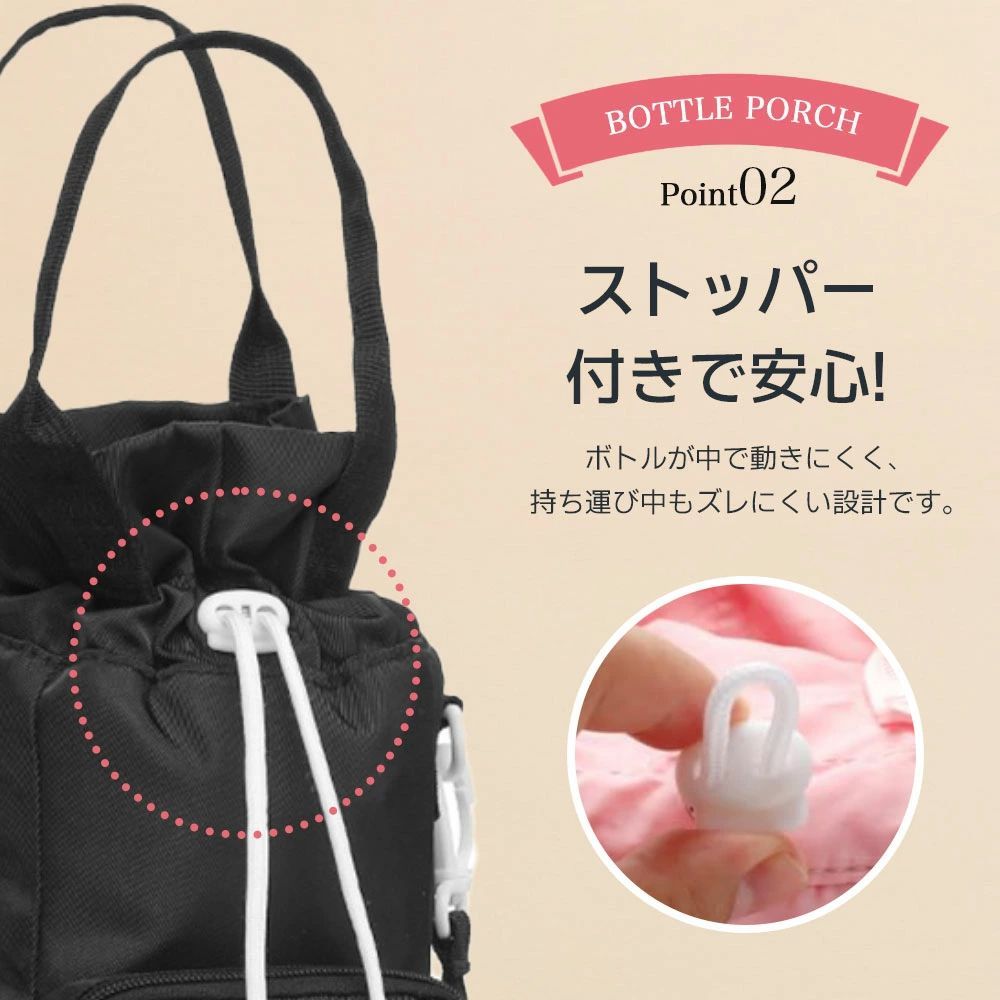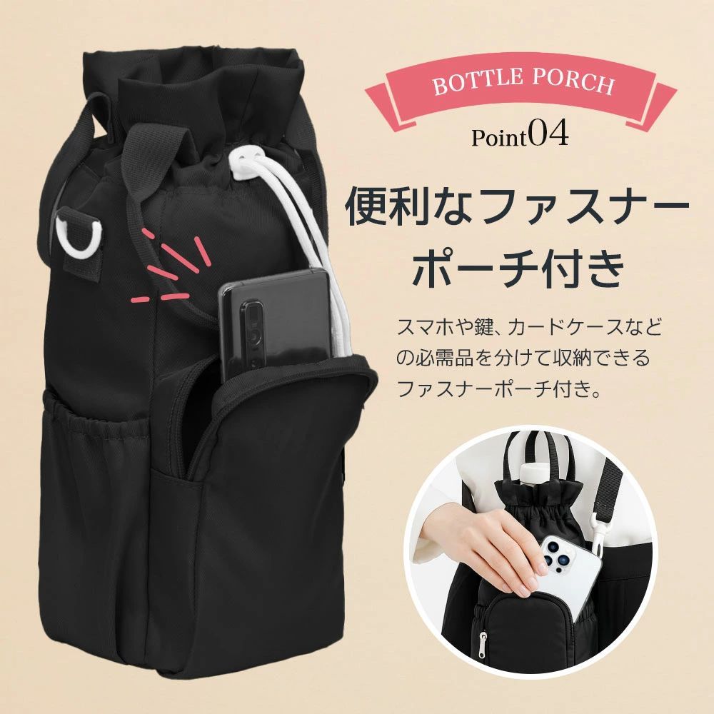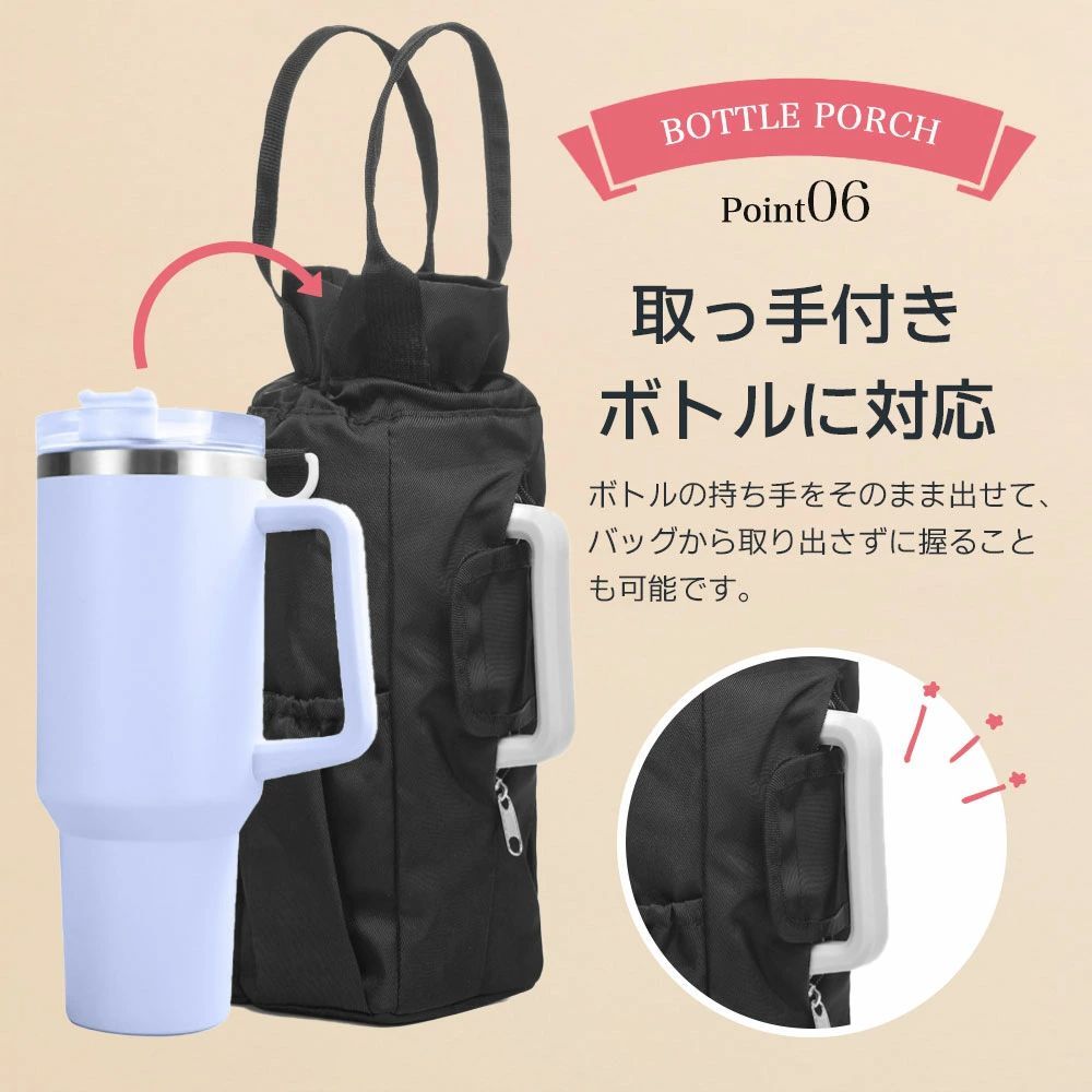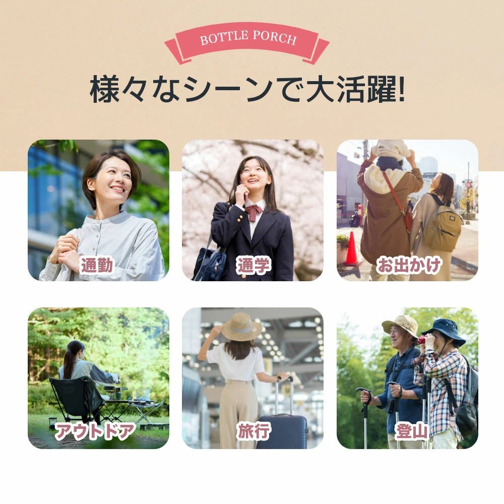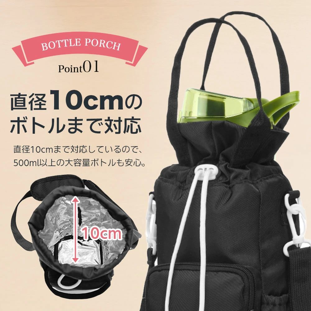 最大直径約10cmのボトルまでしっかり収納可能。500ml以上の大容量ボトルにも対応し、通勤・通学・アウトドアにも安心して持ち運べます。