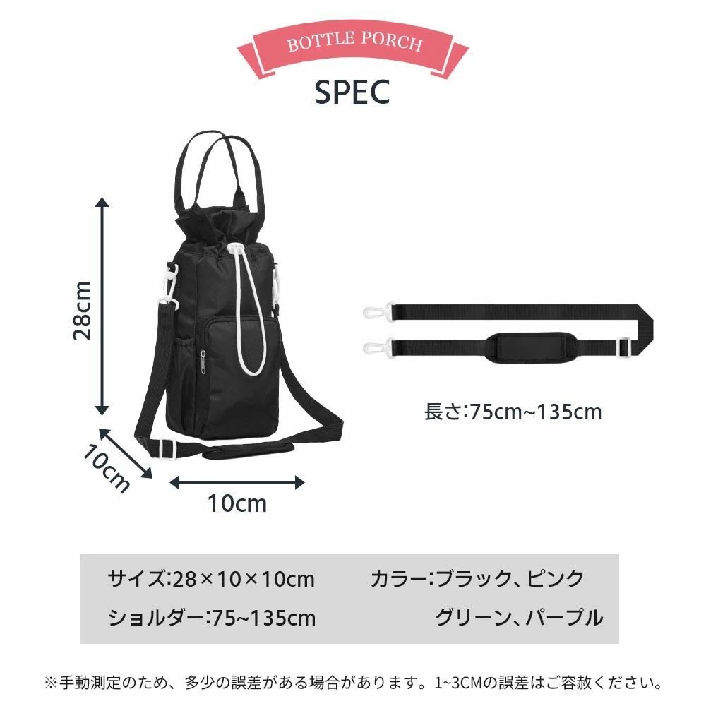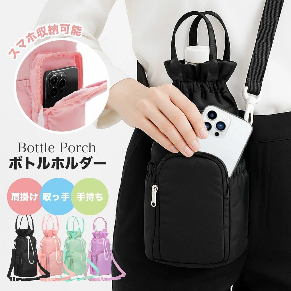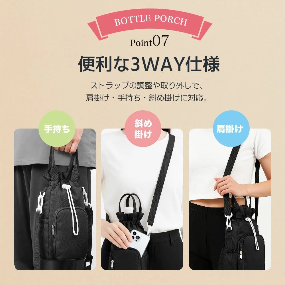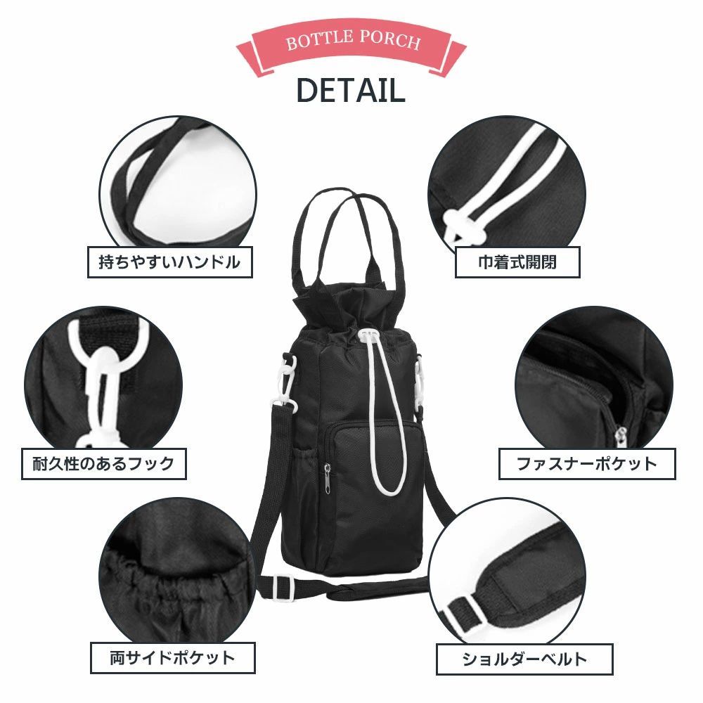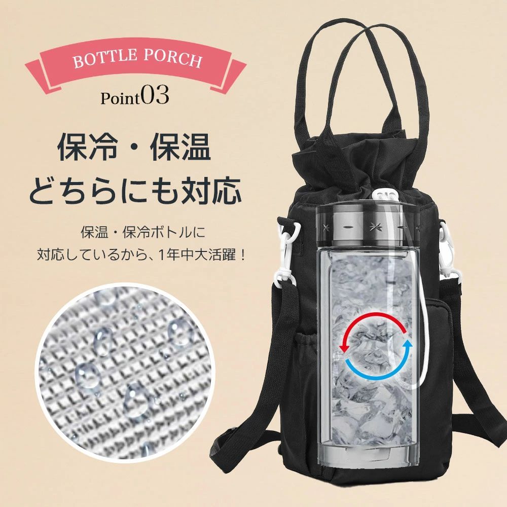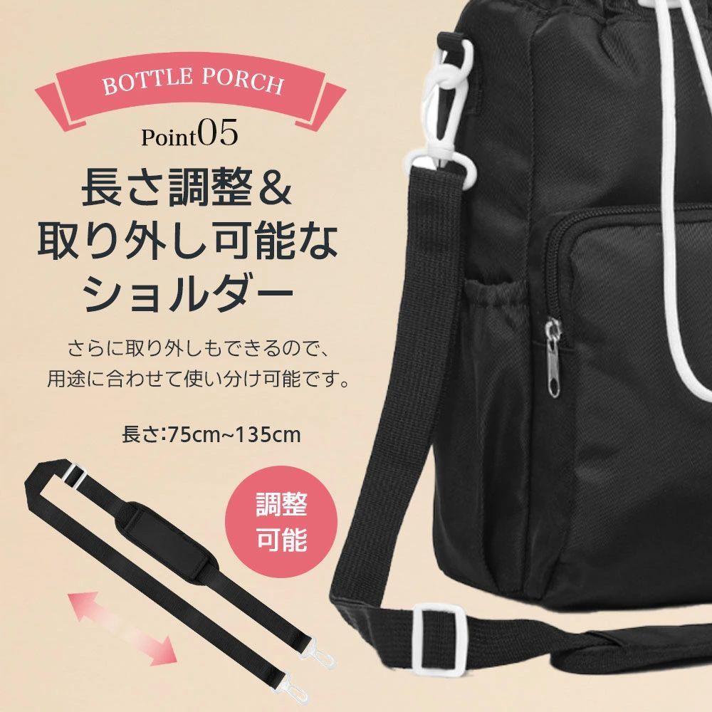 最大直径約10cmのボトルまでしっかり収納可能。500ml以上の大容量ボトルにも対応し、通勤・通学・アウトドアにも安心して持ち運べます。