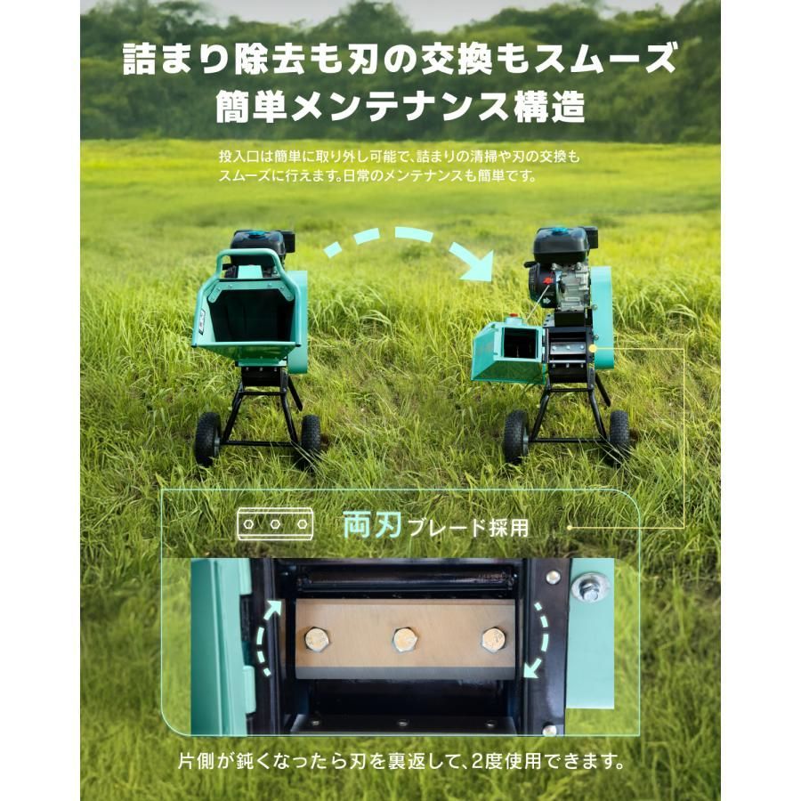 【最大粉砕径105mm竹のみ・212cc 7馬力エンジン搭載】COY-380は、最大粉砕能力105mmのハイパワー仕様。212cc・7馬力の空冷4ストロークOHVエンジンを搭載し、安定したパワーで固い木材も連続して粉砕可能です。燃料はレギュラーガソリン、タンク容量3.6L。排気もスムーズで、家庭用としてはもちろん、農園・果樹園・造園業・自治体管理など幅広い現場で活用されています。
