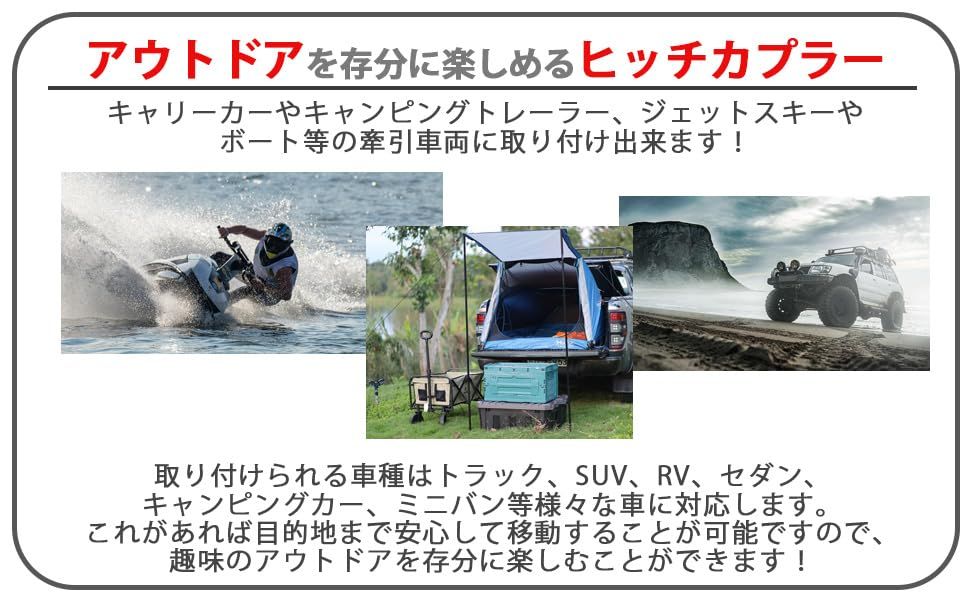 キャリーカーやキャンピングトレーラー、ジェットスキーやボート等の牽引車両に取り付け出来ます。取り付けられる車種はトラック、SUV、RV、セダン、キャンピングカー、ミニバン等様々な車に対応します。