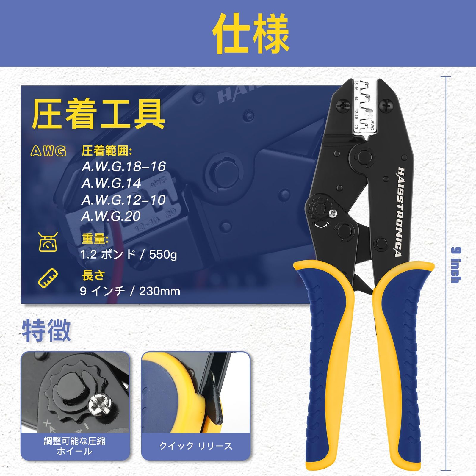 haisstronica圧着ペンチ ラチェット式 オープンバレル端子圧着ペンチ圧着工具 AWG20-10(0.51~5.26mm2)ラチェット圧着工具、ワイヤー端子圧着装置HS-5327