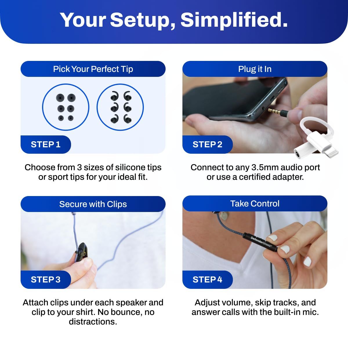 このイヤホンには、3つのシリコンイヤーチップサイズと、3つのサイズの交換可能なスポーツチップが含まれており、ランニングやワークアウト中にずれません。安全性を高めるために、付属のクリップ(2個)を使用してシャツやジャケットにワイヤーを取り付けることを強くお勧めします。コード付きイヤホンはポータブルで、毎日の使用に最適で、最大限の快適さと機能性を提供します。