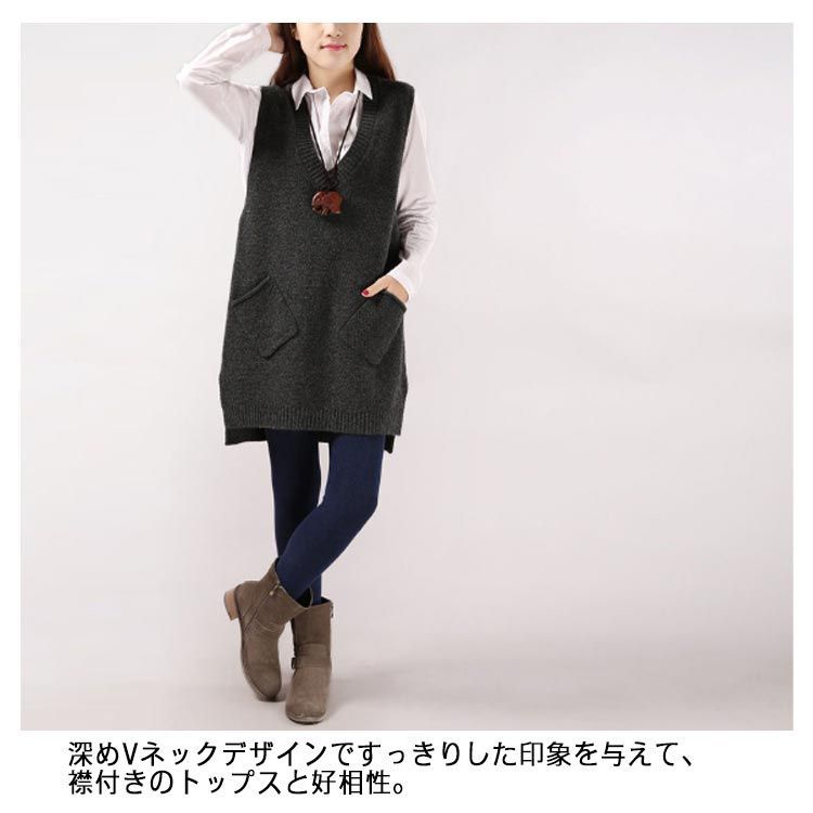 深めVネックデザインですっきりした印象を与えて、襟付きのトップスと好相性。