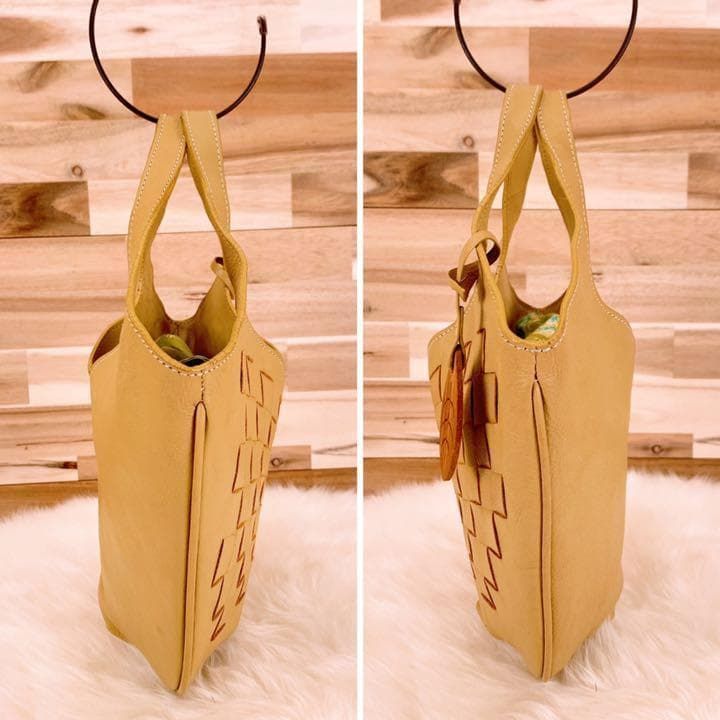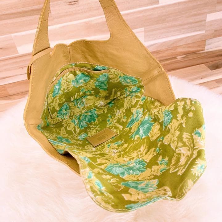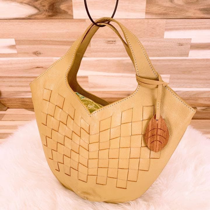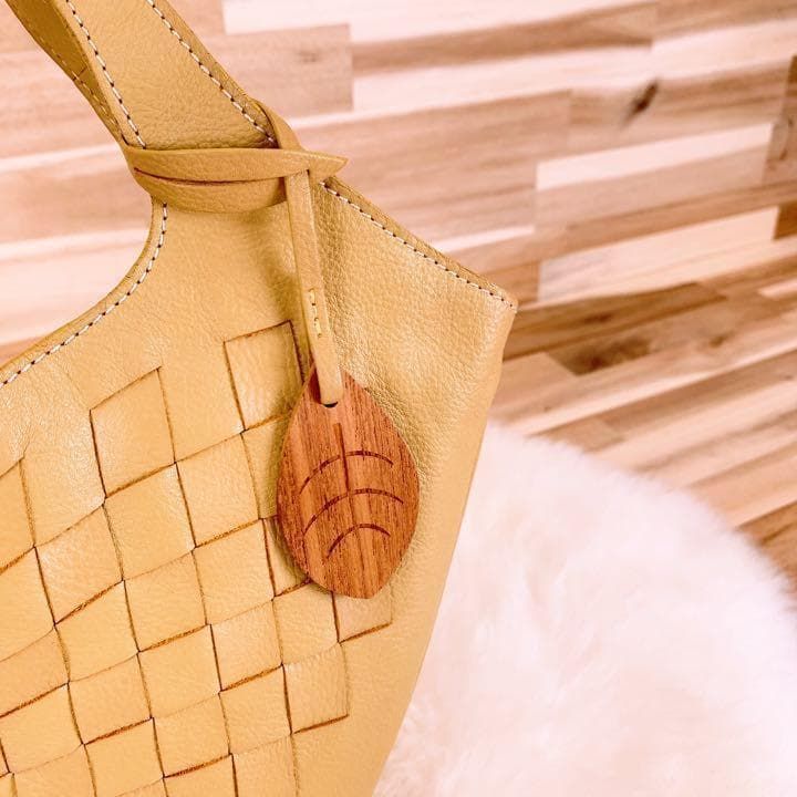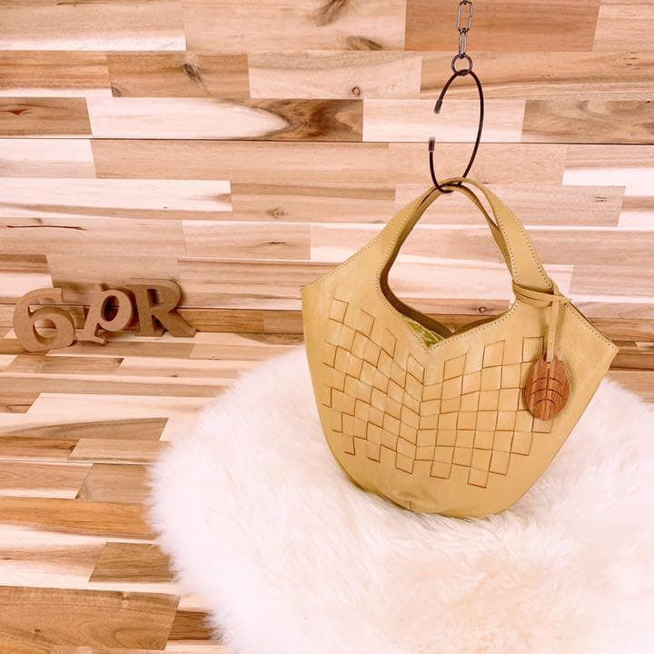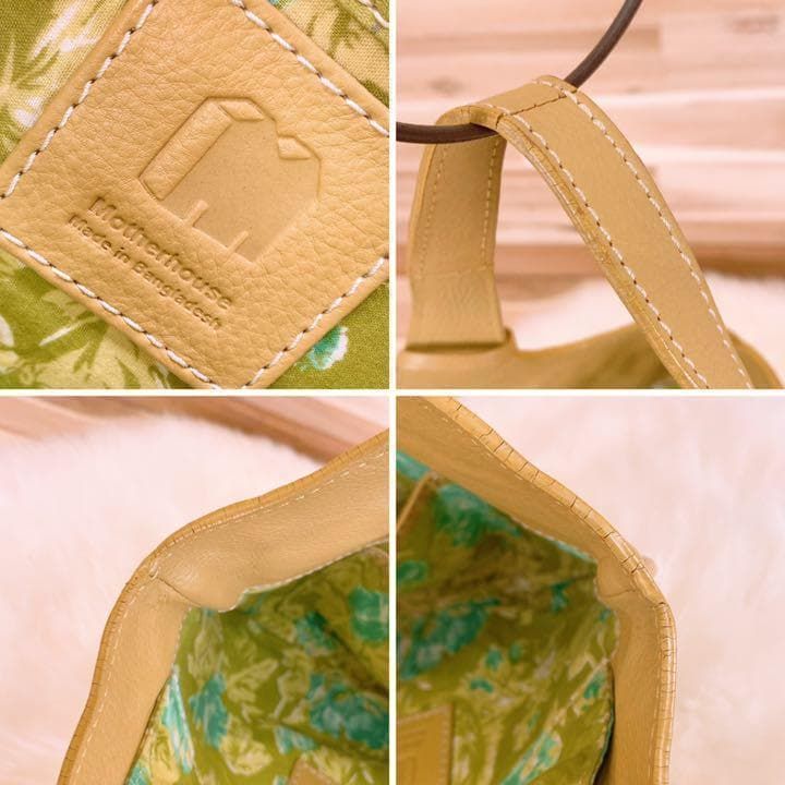 上品なベージュのレザーを丁寧に編み込んだ、柔らかくもしっかりとした手ざわりが魅力。内側には爽やかなグリーン×ブルーの花柄が広がり、開けるたび心ときめくアクセントに。ナチュラルなコーデやリネン素材との相性も抜群で休日の散歩やカフェタイムにもぴったりなMOTHERHOUSEのハンドバッグです。