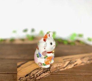 メーカー直送 九谷焼 招き猫 幸福 置物 デコ盛 花づくし 白 4号(金運・千客万来)木箱台無し