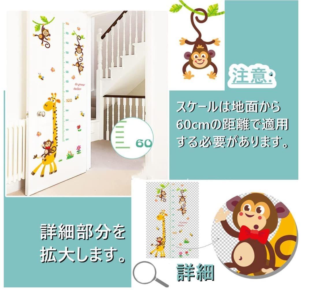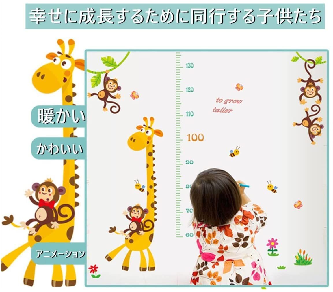 【身長計】壁やドアに使用されている高度計のウォールステッカーです。 また、高さ計などに使えるかわいい動物のウォールステッカーも付いています。 子供部屋、居間、ドア、寝室などでお子様と一緒に貼り付けをお楽しみいただけます