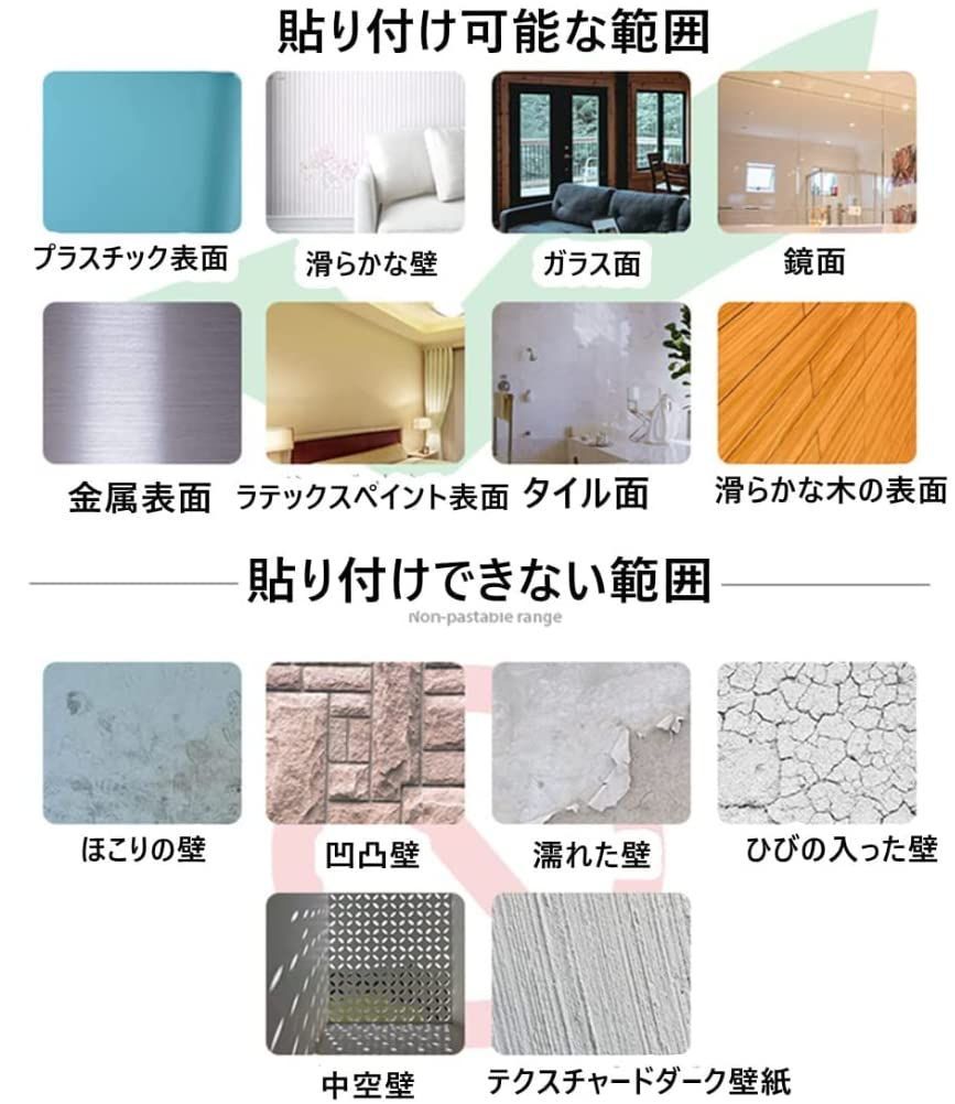 【注意】ウォールステッカーは粘着力はありますが、貼り付けを繰り返すと弱くなります。 再装着の際は、裏面のホコリや汚れを取り除いてから再装着してください。