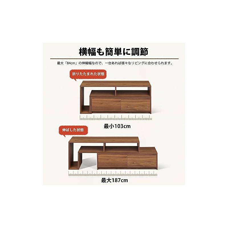 【自由な横幅】横幅が103~187cmの間で自由に調節出来る伸縮機能付きのテレビ台です。スライド可能な天板部分は裏表がないので、左右どちらでも設置できます。リビングにかぎらず、お使い方次第にレイアウトして寝室などのデッドスペースを上手に活用できます。