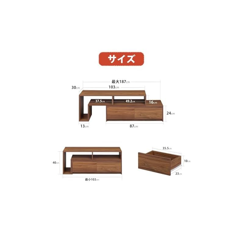 【自由な横幅】横幅が103~187cmの間で自由に調節出来る伸縮機能付きのテレビ台です。スライド可能な天板部分は裏表がないので、左右どちらでも設置できます。リビングにかぎらず、お使い方次第にレイアウトして寝室などのデッドスペースを上手に活用できます。