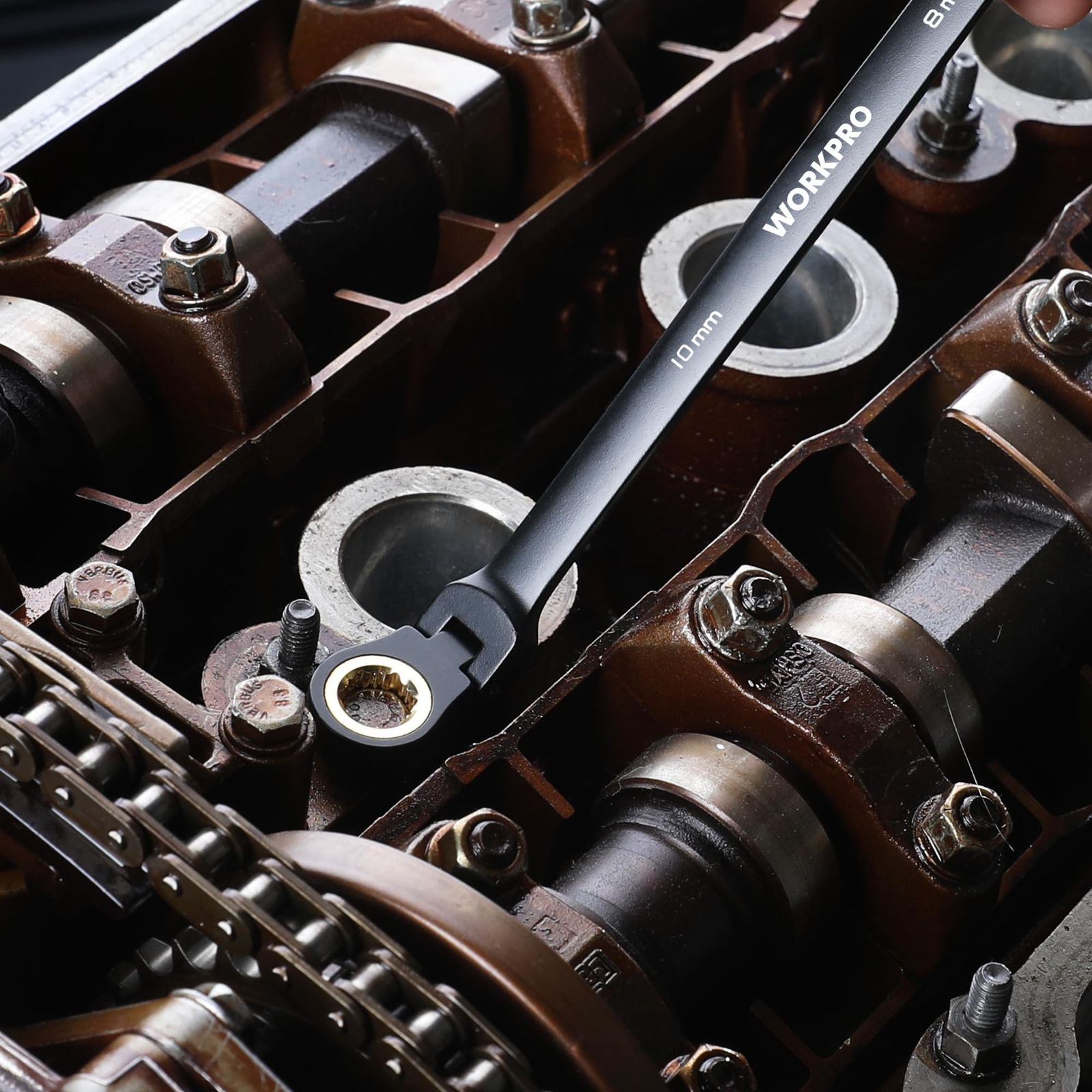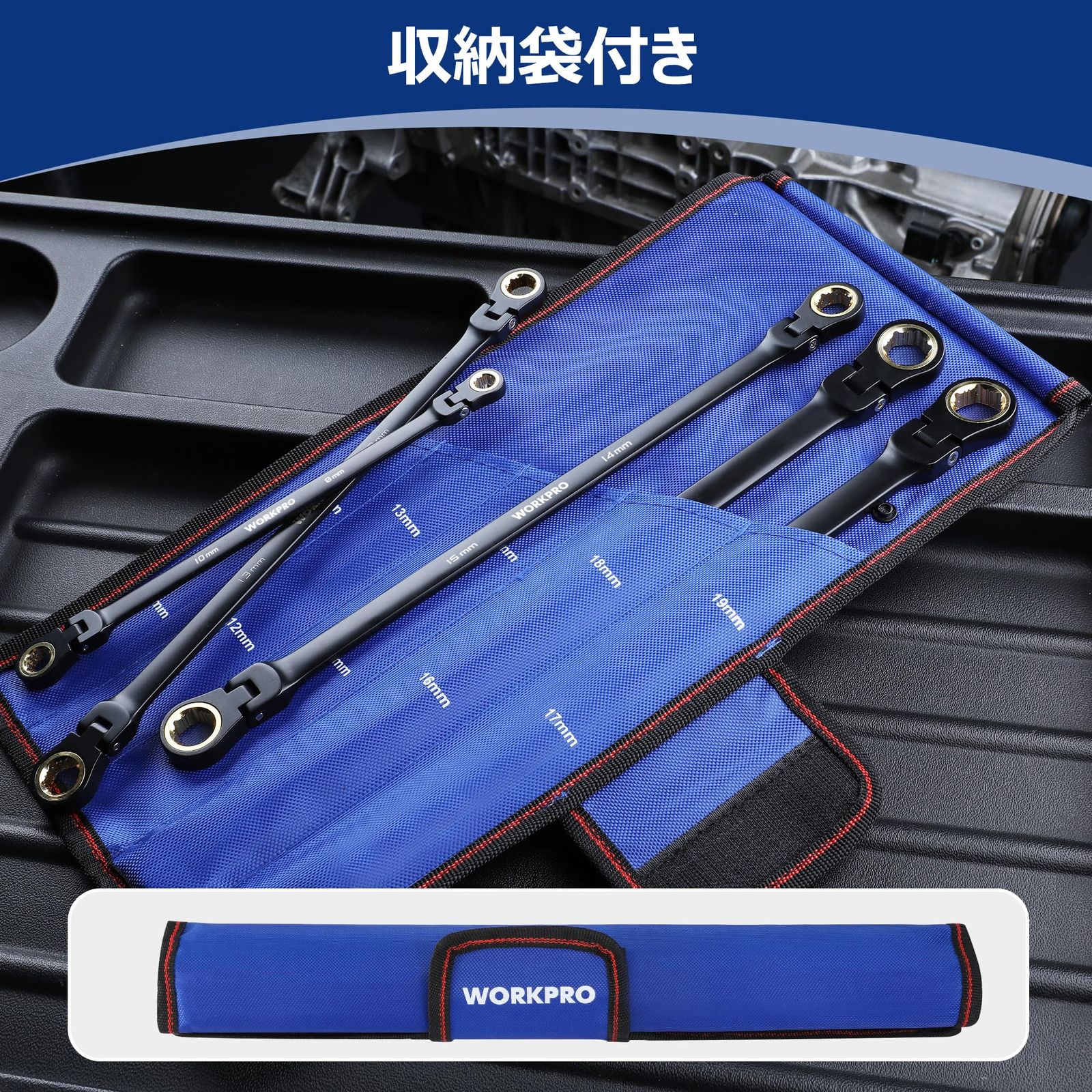 WORKPRO メガネレンチセット フレックスラチェットレンチ ラチェットメガネレンチ 首振りロングタイプ なめたボルト・ナット対応可能 5本組 72ギア 滑り止め 両頭首振型 CR-V製 組み立て 自動車修理 メンテナンス用 収納袋付き