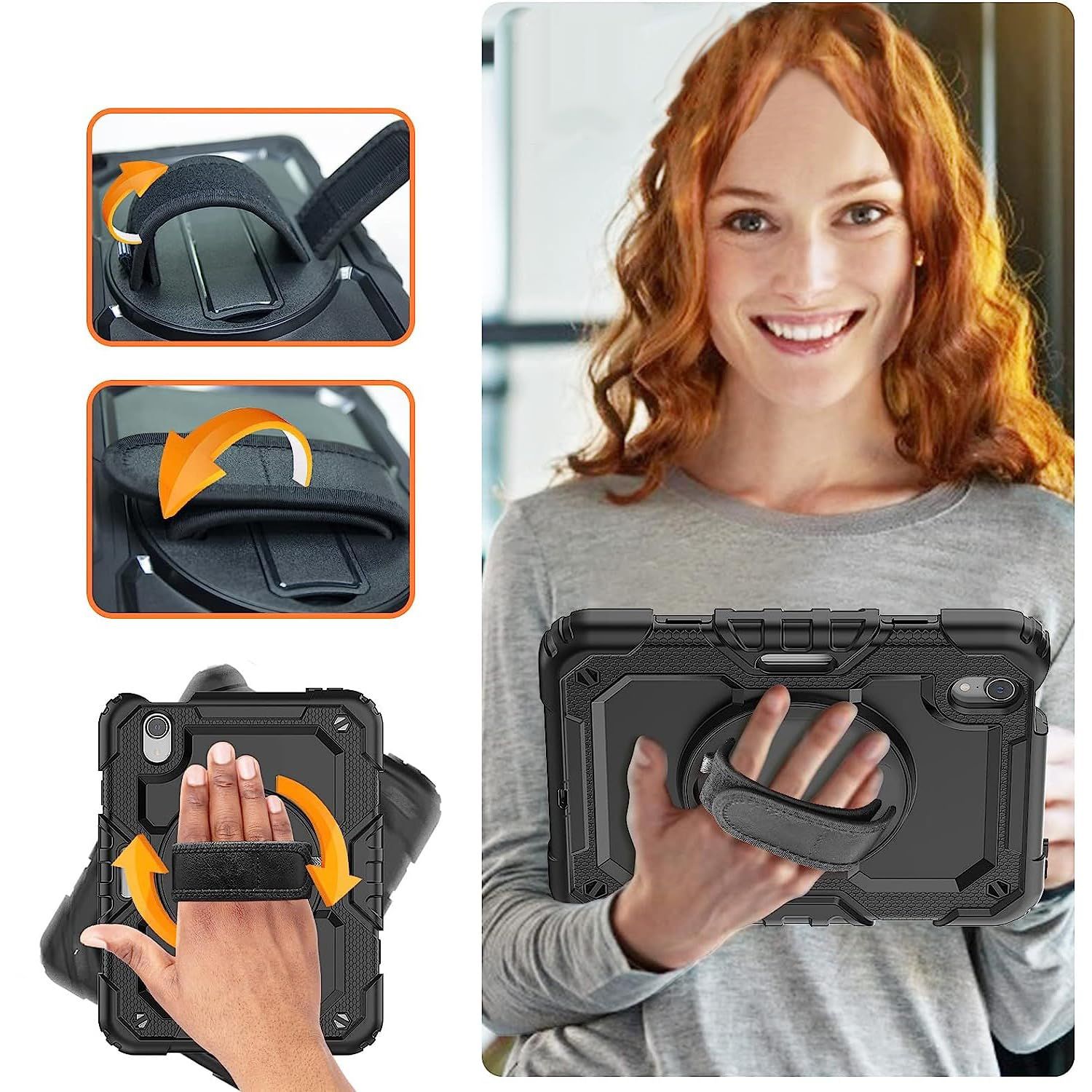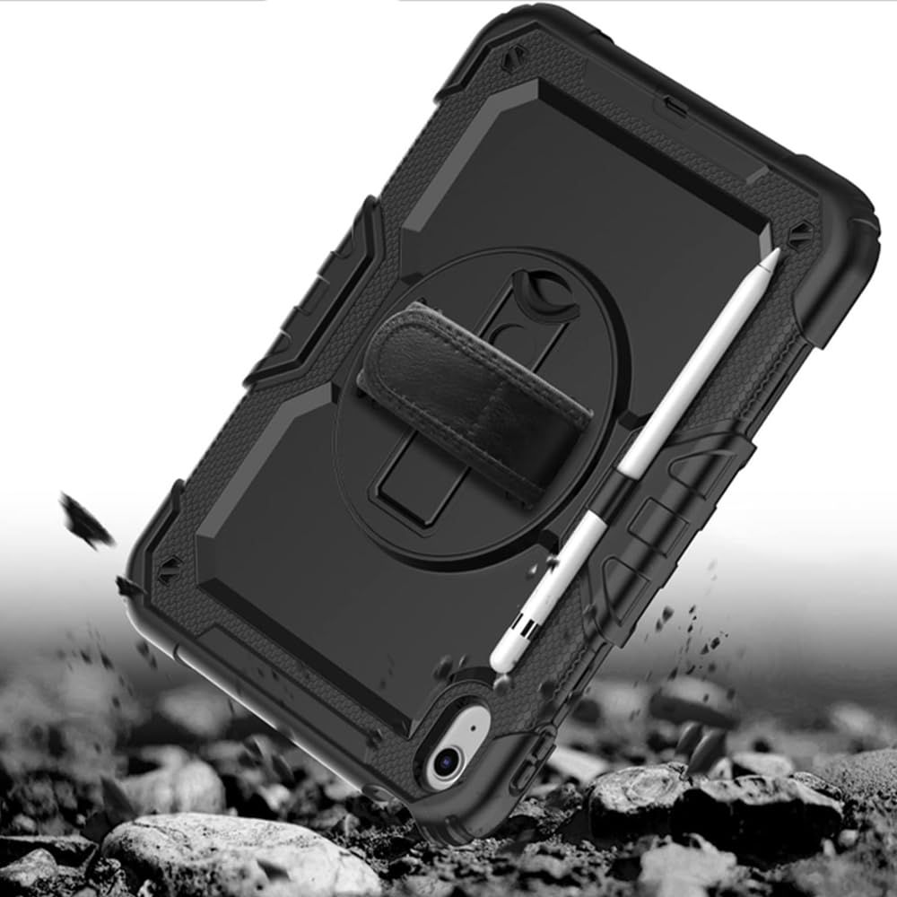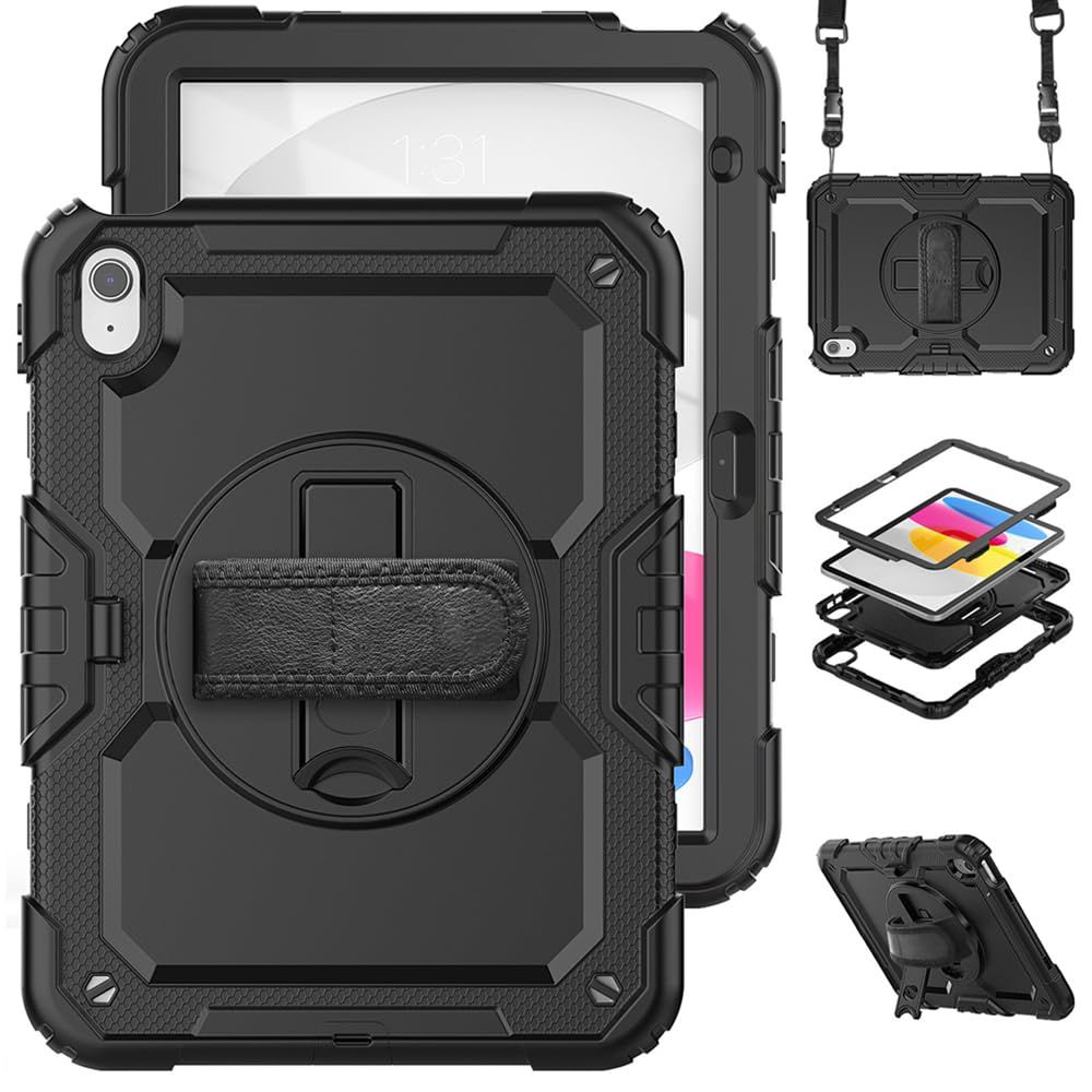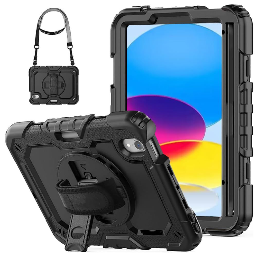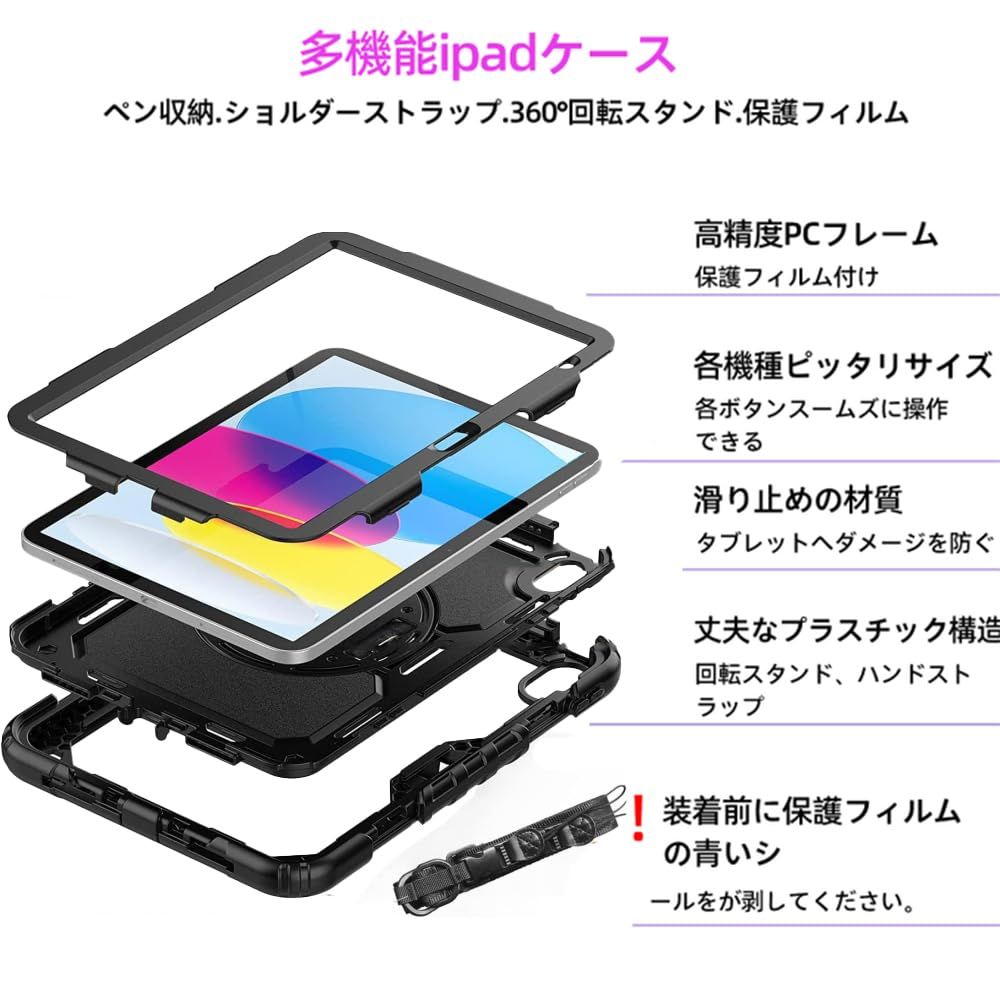 iPad 第10世代 10.9インチケース2022 ipad 11(A16)ケース2025モデル 保護フィルム付き ペン収納 360°回転スタンド ハンドストラップ ショルダーストラップ 耐衝撃 全面保護カバー 多機能 iPad 10.9 インチ タブレットPCケース (ブラック)