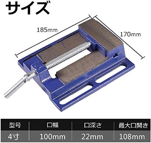 ☆卓上万力 4寸 100mm ブルー!!☆ ◆ドリル作業の効率アップ!◆ ボール盤のテーブルに取り付けて、ヤスリかけや穴あけ作業、切削加工最適です。 ◆シャフト付でスムーズなスライドが可能◆ 底面の平面は滑り止め加工がしてあり、ボール盤テーブル上でのガタつきを防止します。 【こんな時に】 ・削ったり磨いたりの作業をしたい ・接着剤が固まるまでモノを動かしたくない ・ねじ止め・外しの際にモノに動いてほしくない などDIYや大工作業ほか様々なシーンで活躍すること間違いなしの商品です♪ またボール盤だけでなく、作業台で固定すれば平バイスや卓上バイスとしてもご使用いただけます。 【商品詳細】 ■サイズ:約185×170mm ■口 幅:約100mm ■最大口開き:108mm ■口深さ:約20mm ■重 量:約2kg
