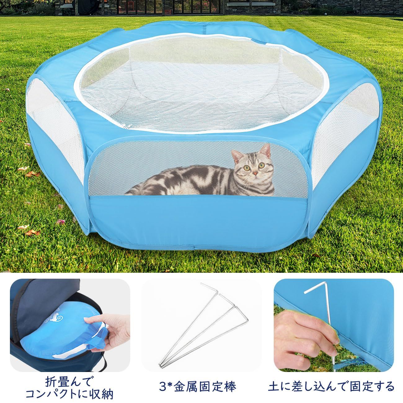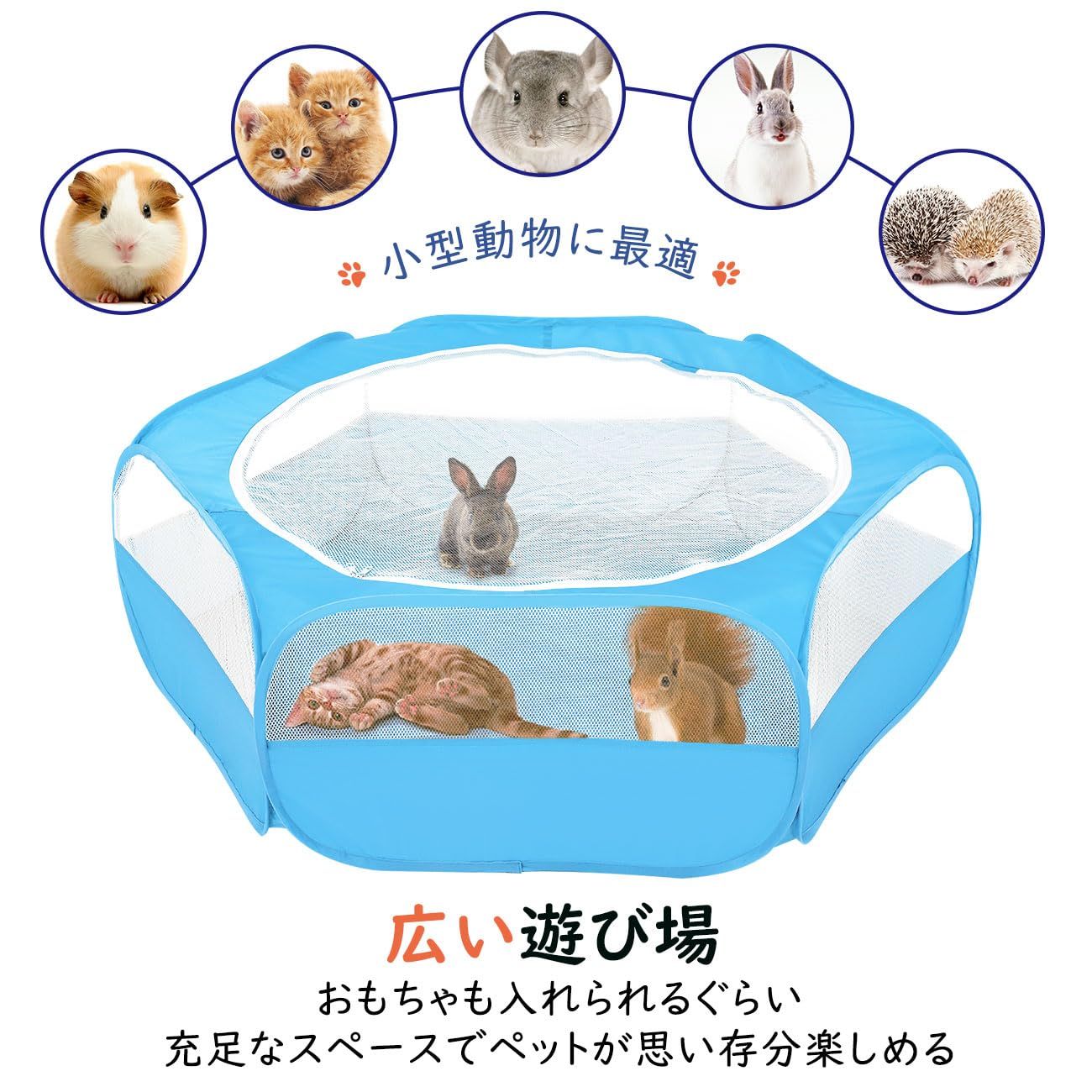 「遊び用小動物サークル」 側面はオックスフォード布+メッシュ素材を採用しており、耐久通気性に優れています。ファスナー式のメッシュ屋根付き、ペットの飛び出すを防止します。猫、小型犬、ウサギ、ハリネズミもなどの小型動物に最適です。