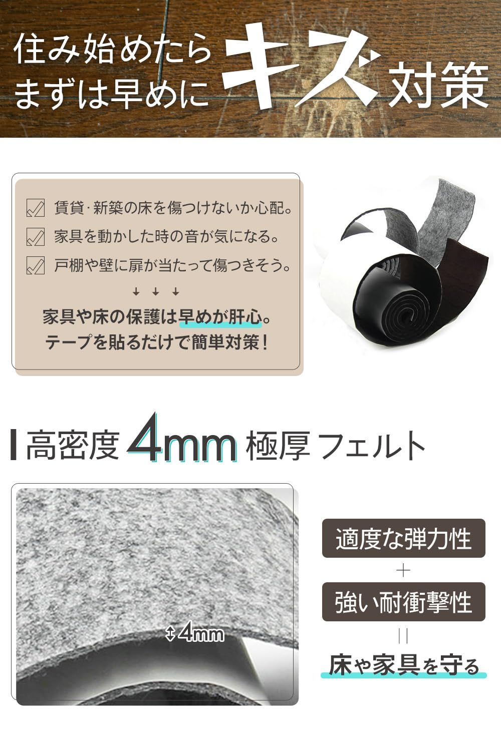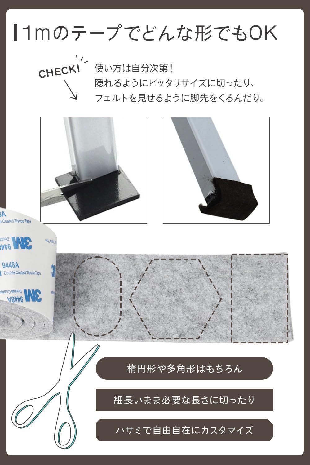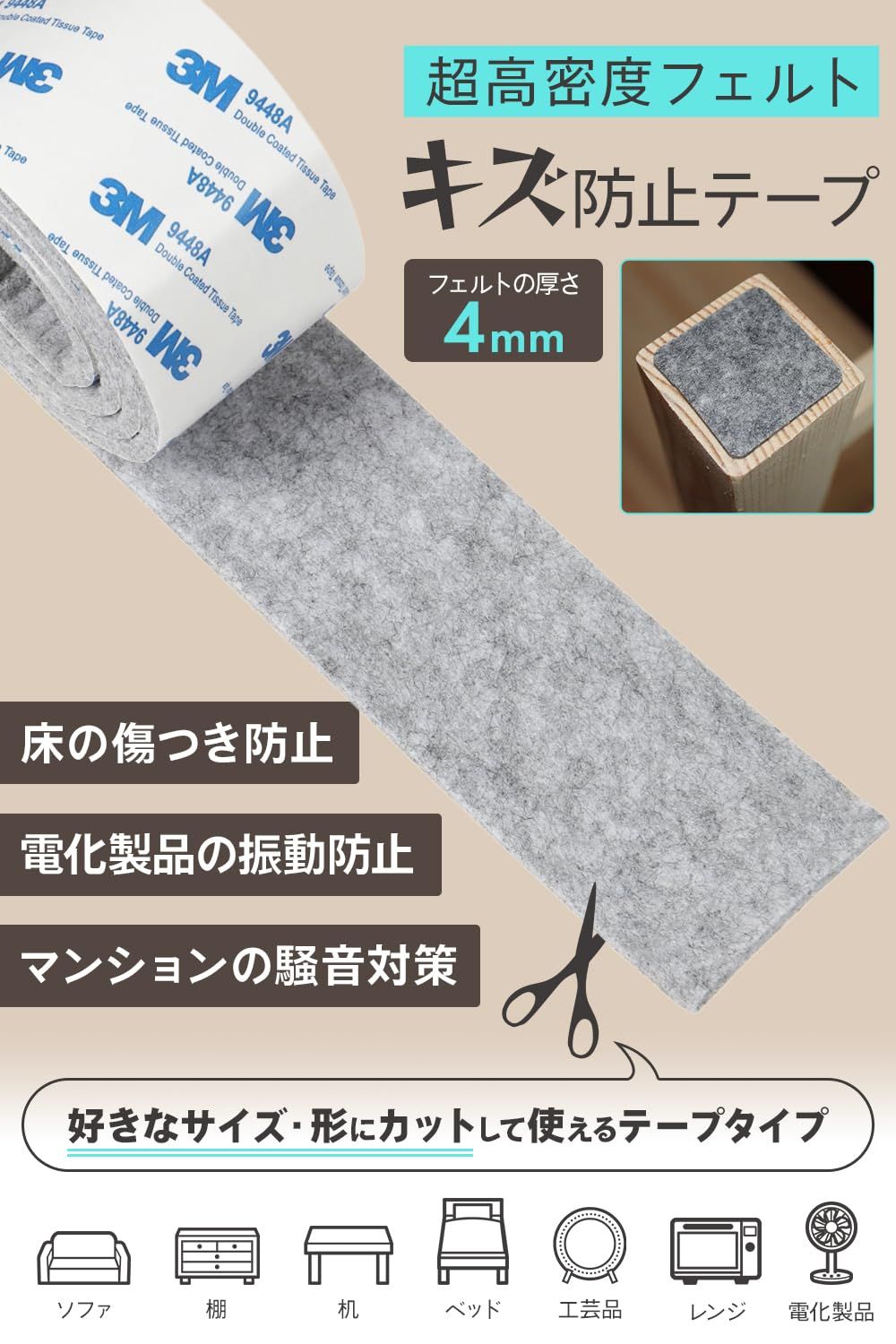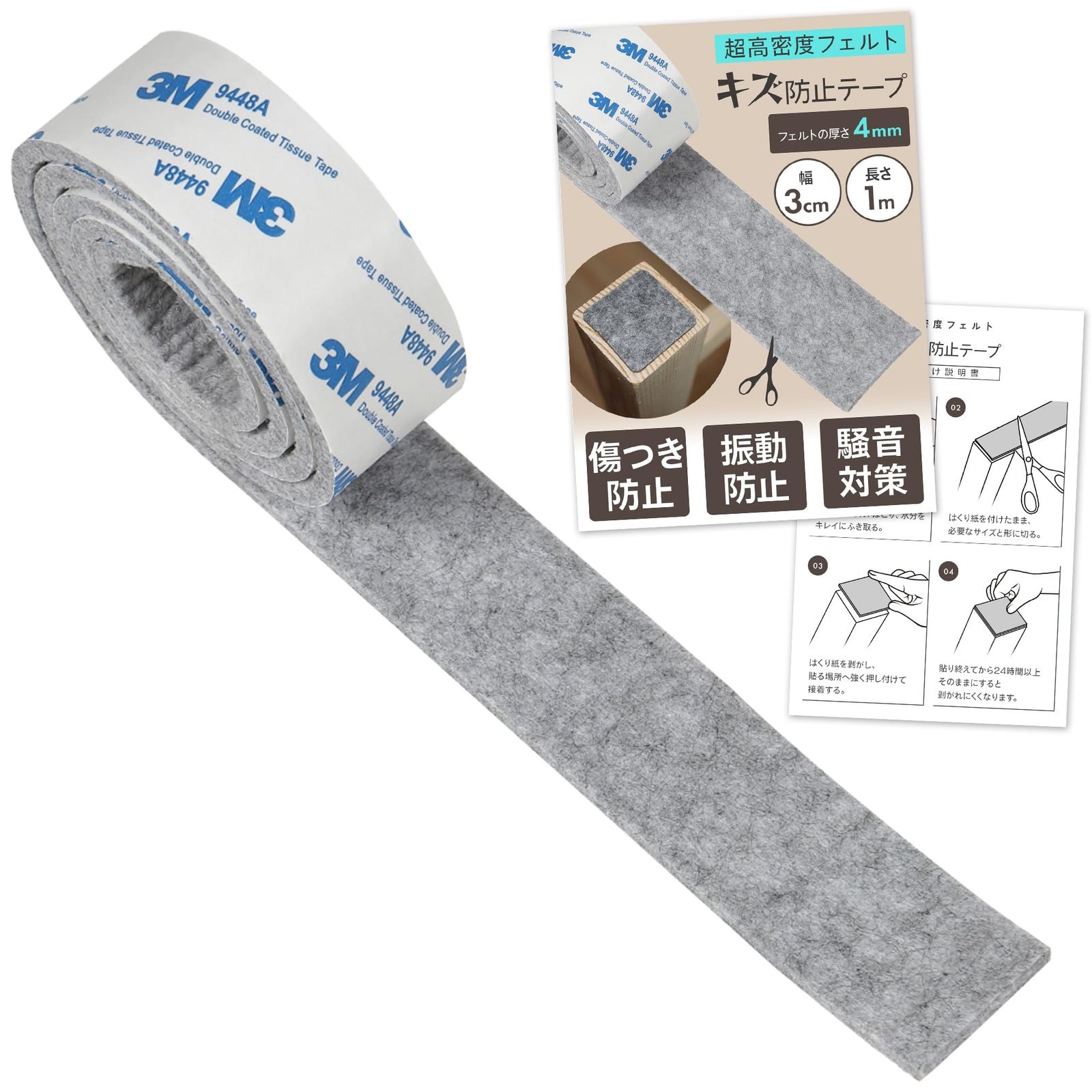 【ふかふか厚フェルト】 傷防止 床保護 テープ 簡単カット 騒音対策 椅子 テーブル ソファー 家具 (グレー 幅3cm x 長さ1m)
