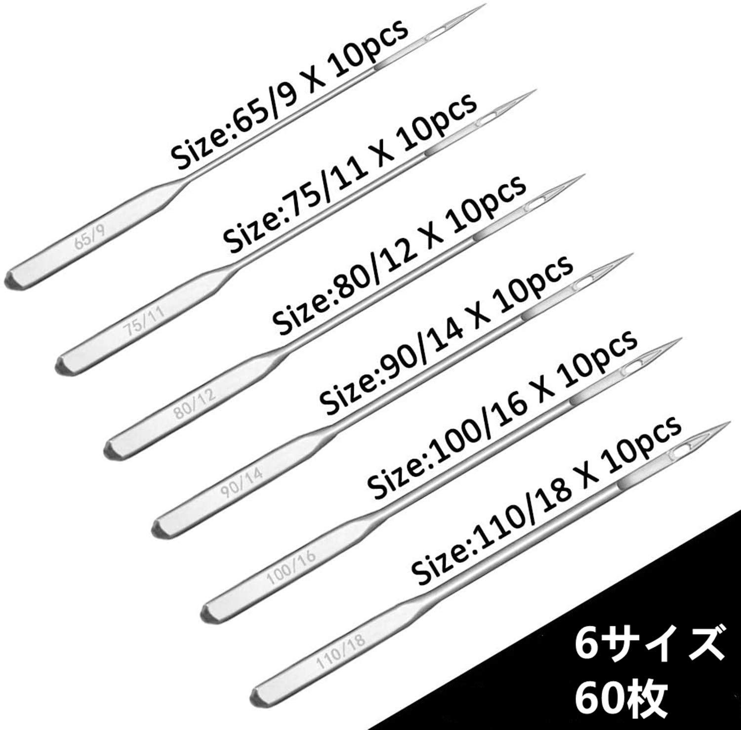 4ミシン針セットの内容:6つの異なる寸法のミシン針で、全部60本です。9#*10本、11#*10本、12#*10本、14#*10本、16#*10本、18#*10本。収納専用ケースが搭載したので、持ちやすく、貯蔵も便利です。