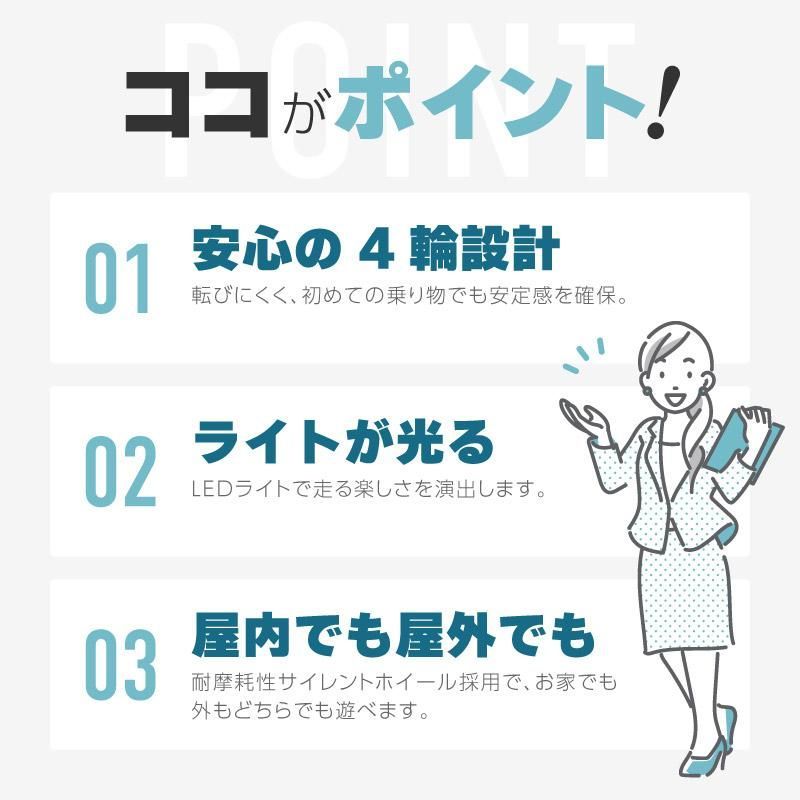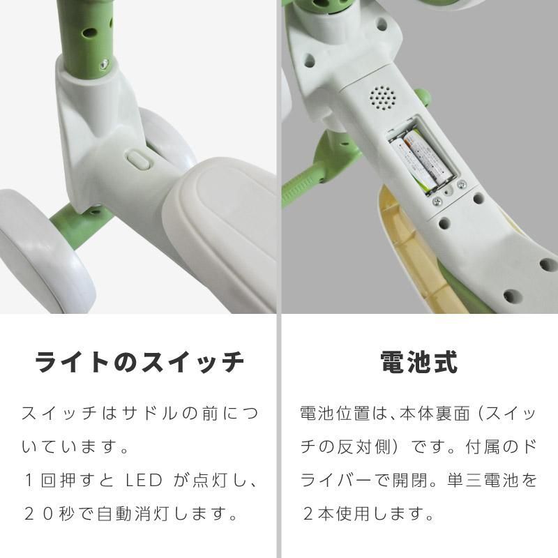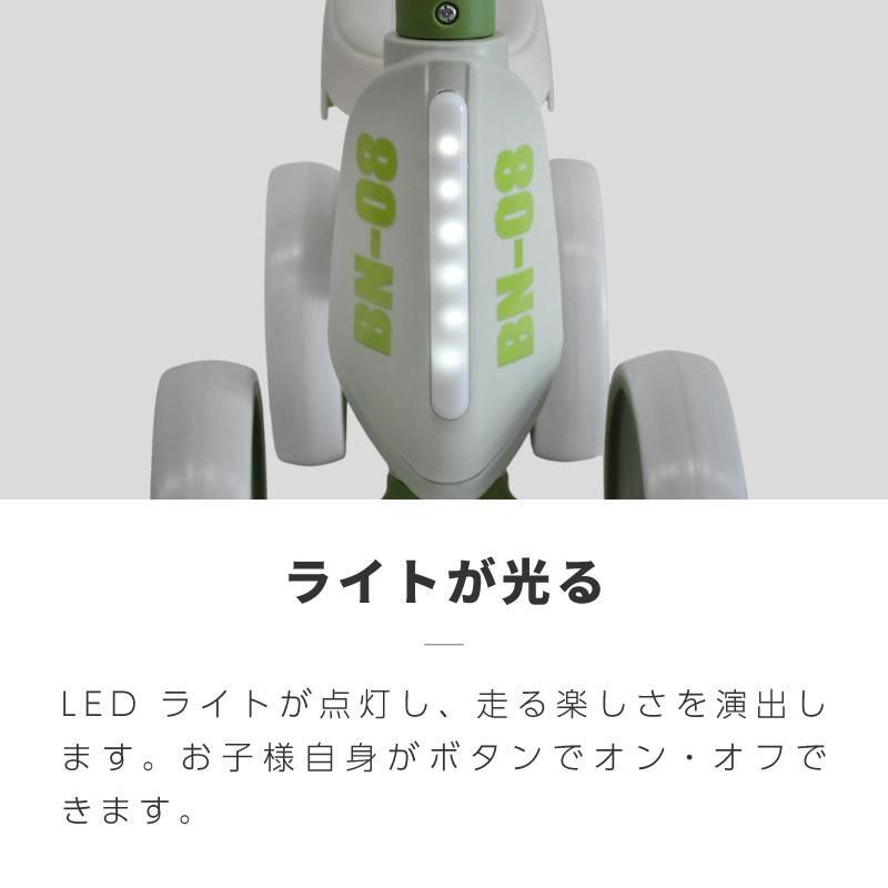 ライトが光るLEDライトが点灯し、走る楽しさを演出します。お子様自身がボタンでオン・オフできます。