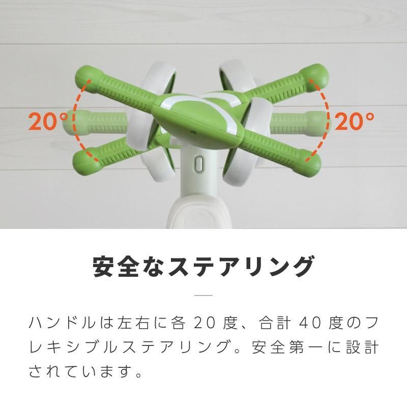 広めの車輪間隔と低重心で、左右のふらつきを抑えます。