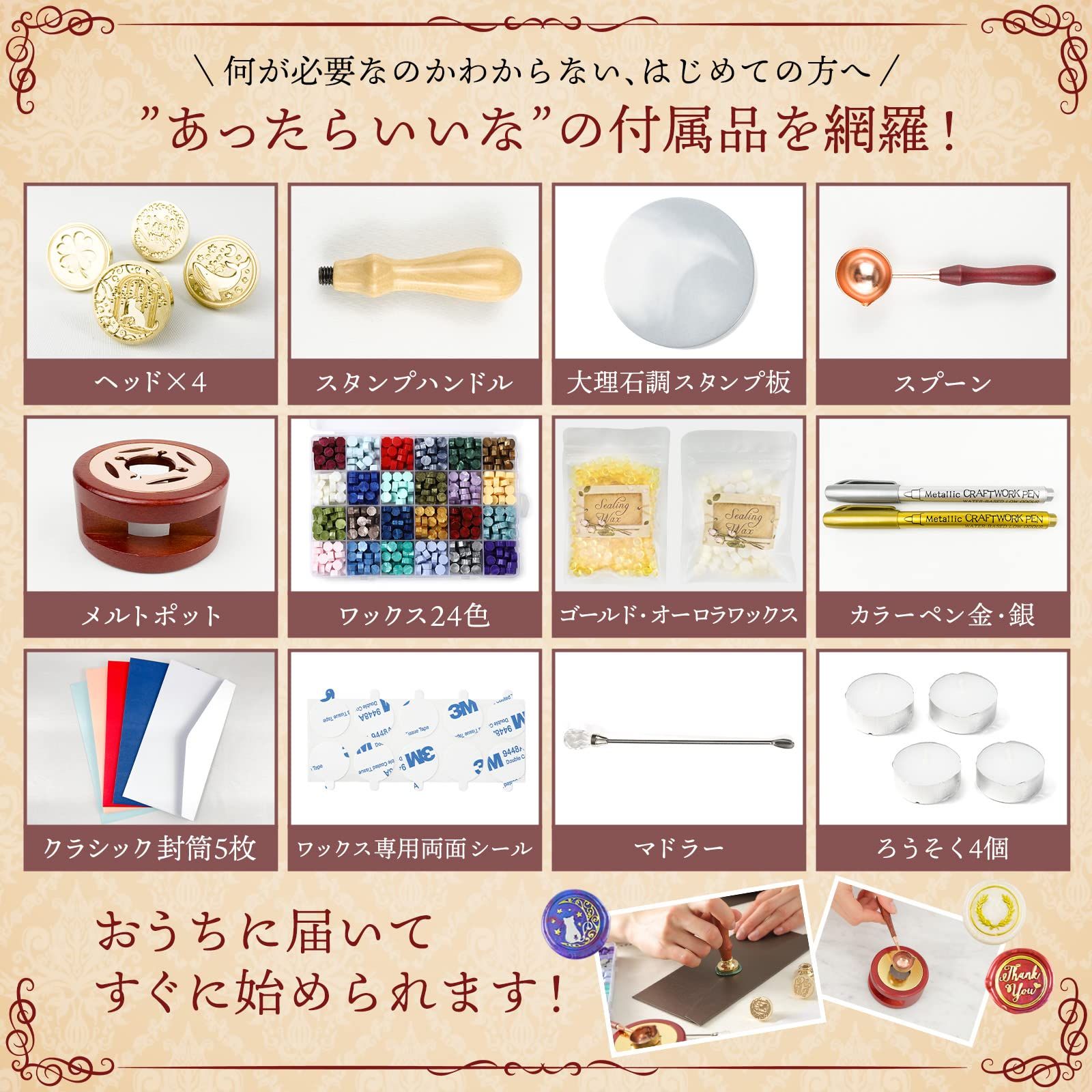 シーリングスタンプ コンプリートセット シーリングワックス セット 印面ヘッド4種 商品ボックス付き オーロラ・ゴールドワックス付属 初心者セット 手紙 招待状 ギフト デコレーション 取扱説明付き (ギフトVer スタンプヘッドA(クローバー・Thank you・月と猫・くじら))