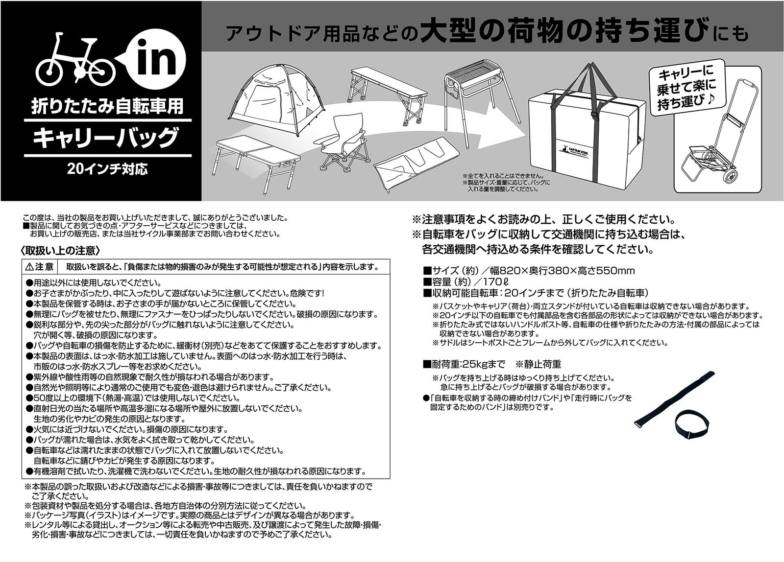 収納可能自転車:20インチまで(折りたたみ自転車)※自転車の折りたたみ方式や仕様、取り付けた部品等によっては収納できない場合があります。※サドルは外してバッグに入れてください。