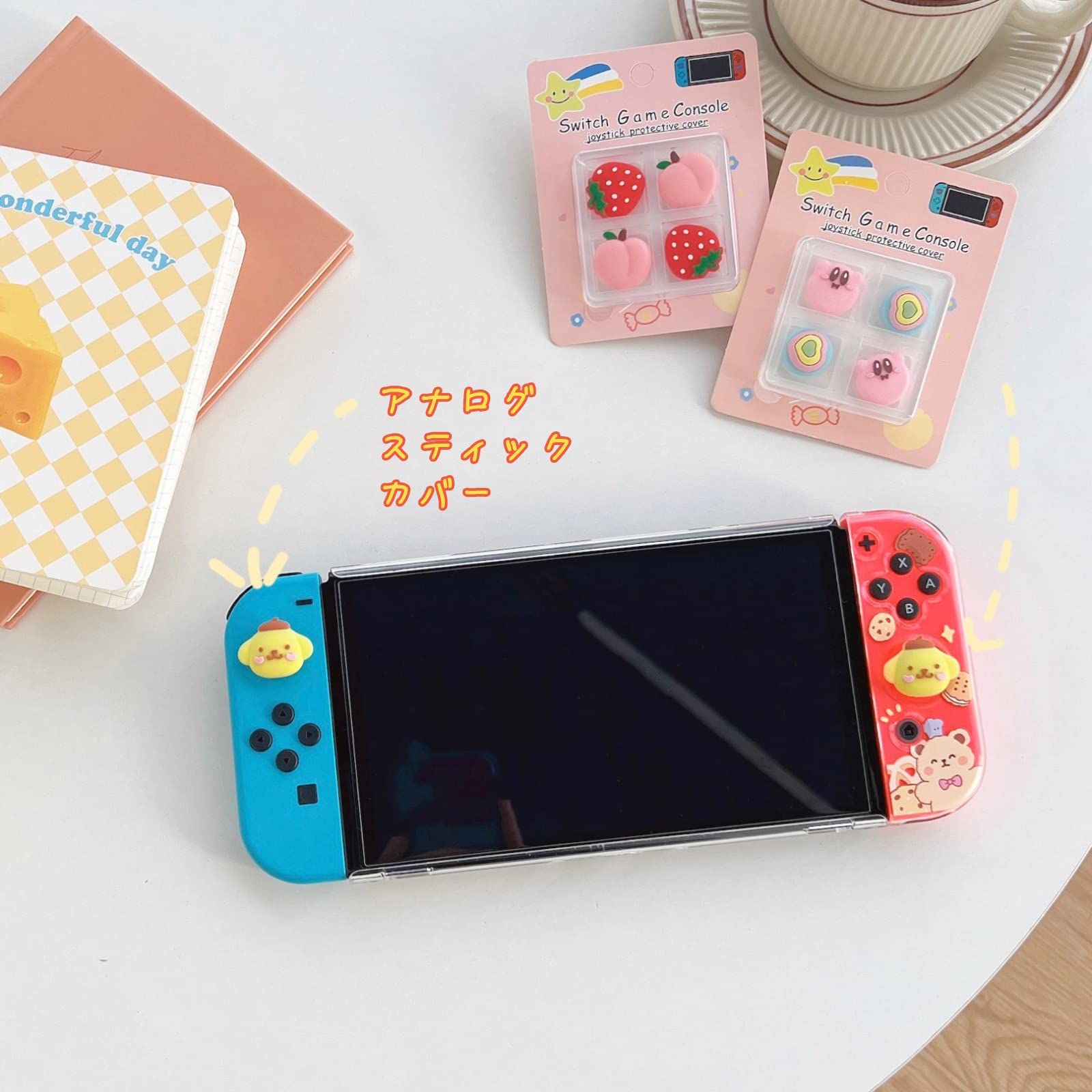 Switch oled lite アナログスティックカバー(4枚入れ)スイッチ ライト 有機el モデル 対応 可愛い フルーツ 桃 いちご アニメ キャラクター ジョイスティック 保護カバー 親指グリップキャップ 全面保護 滑り止め 防汚 取り付け簡単