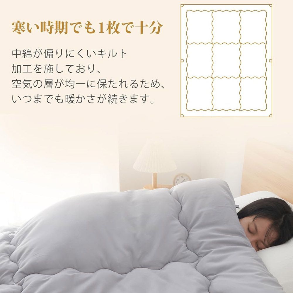 中空ポリエステル中わたが体温で温まった空気をたっぷり蓄え、優れた保温性を発揮。重すぎず軽すぎず、ちょうどいいボリューム感で、季節を問わず快適にお使いいただけます。