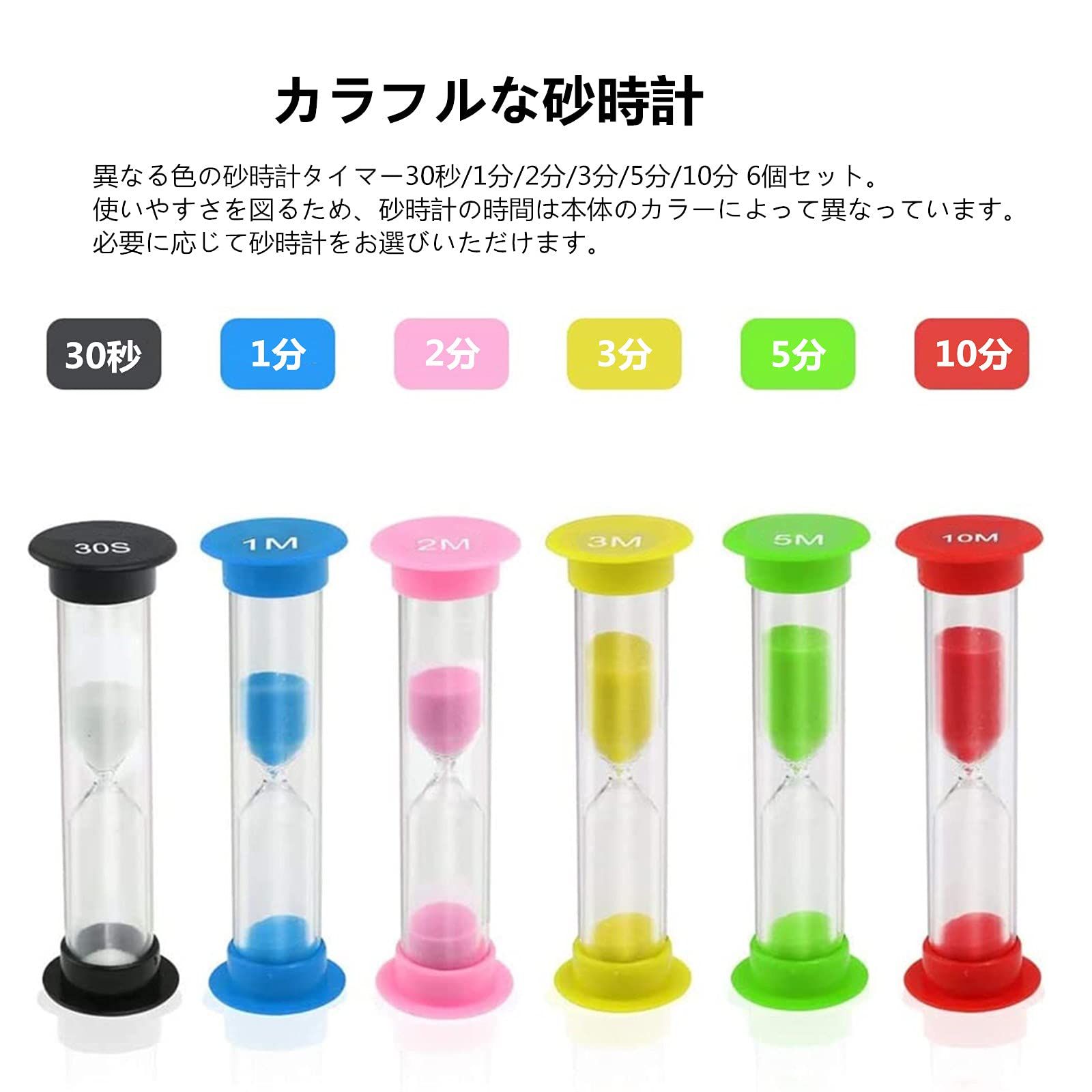 【パッケージ内容】30秒の砂時計1個、1分の砂時計1個、2分の砂時計1個、3分の砂時計1個、5分の砂時計1個、10分の砂時計1個。異なる色の砂時計タイマー6個セット。必要に応じて砂時計をお選びいただけます。