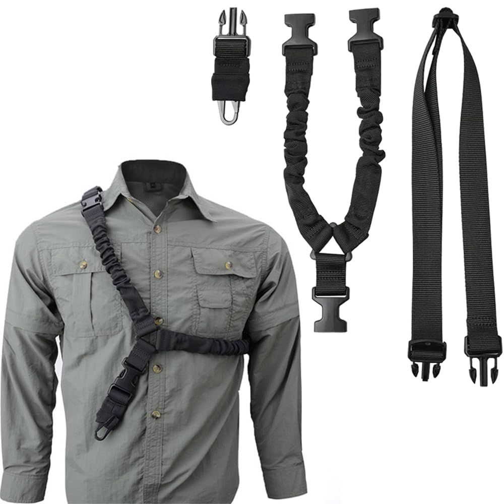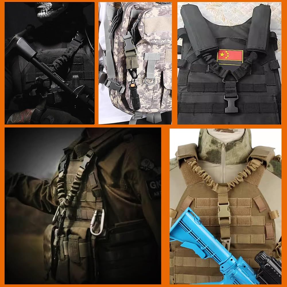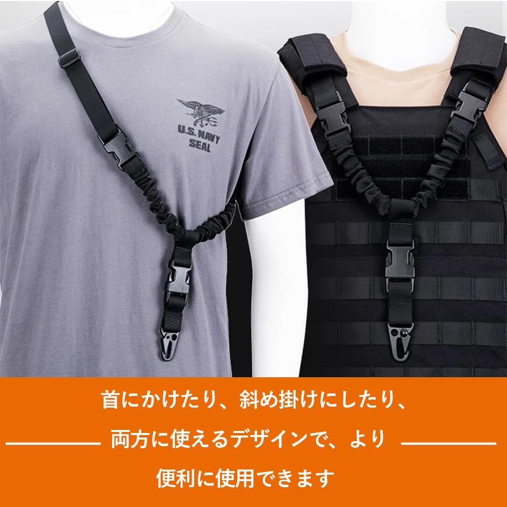 【1点支持で簡単着脱】1点支持タクティカルスリング、必要に応じさっと両手をフリーにすることができます。ハンドガンへの持ち替えなどをスムーズに行えます。先端がバンジーコード(ゴム紐入り)で伸縮して衝撃を吸収。