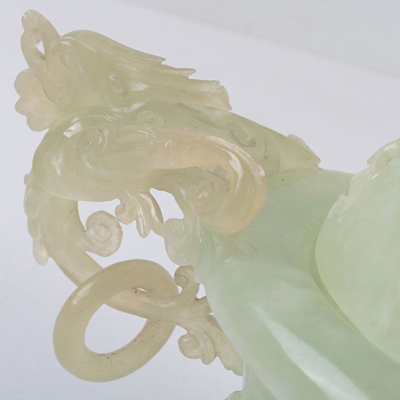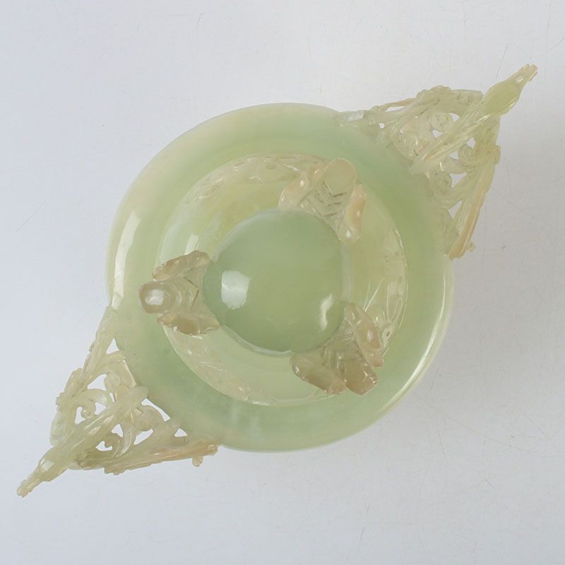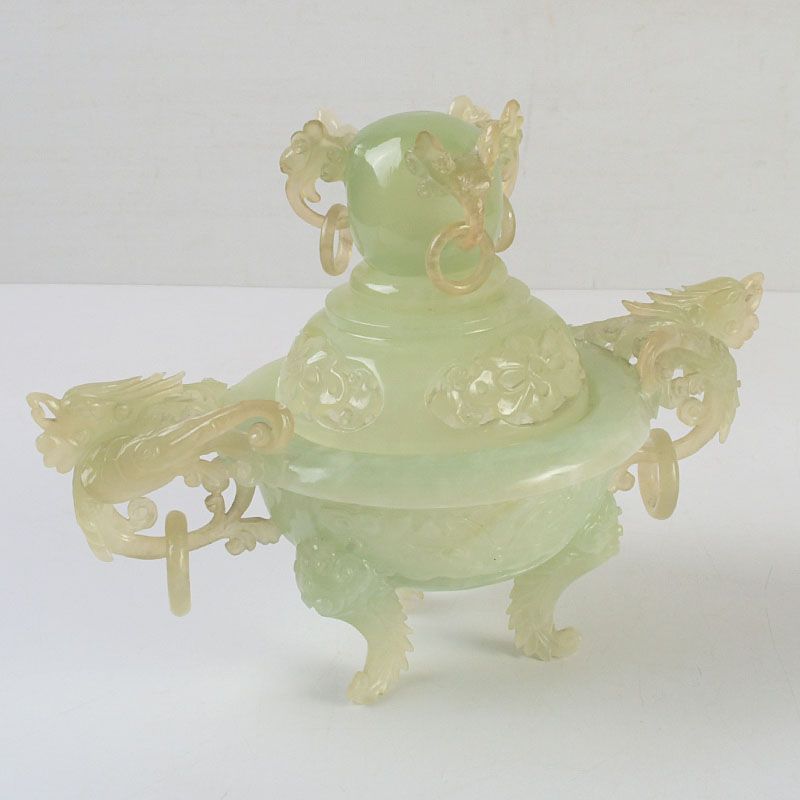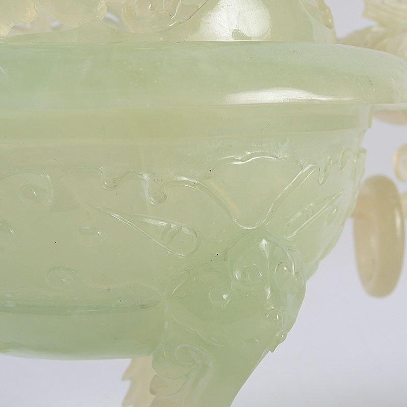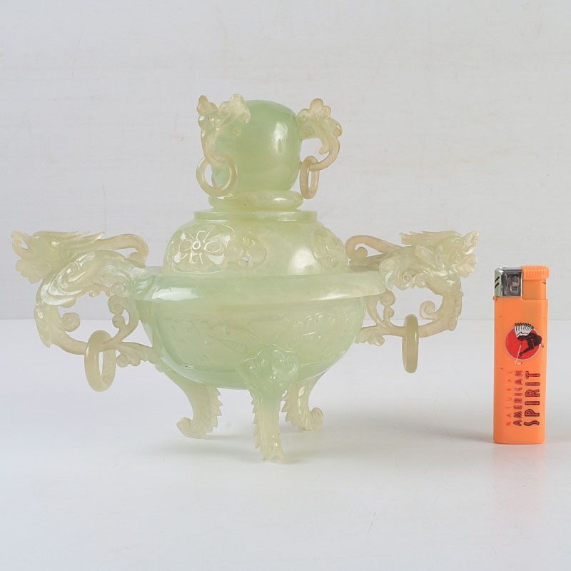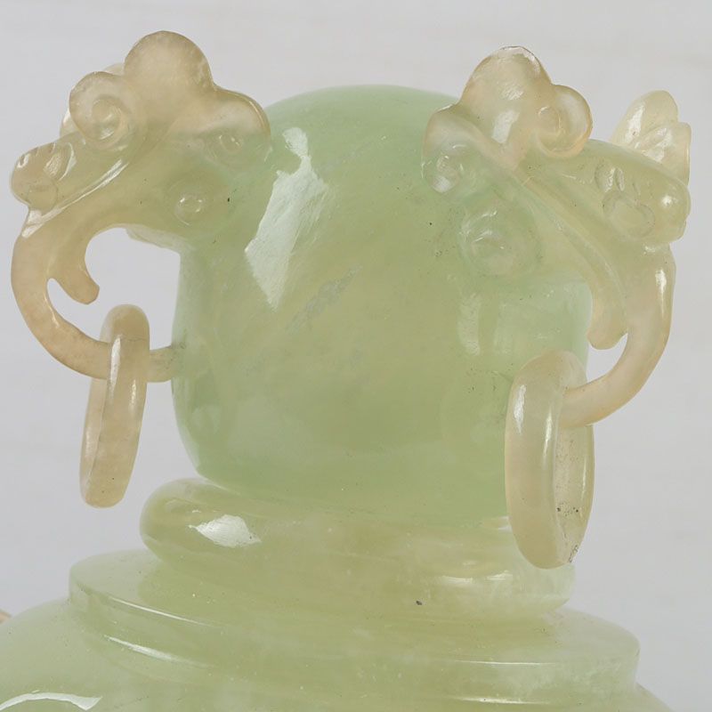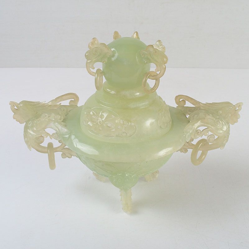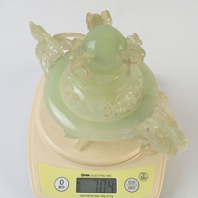 中国 玉石岫玉彫刻 透かし彫遊環 香炉 飾壷 V S300
