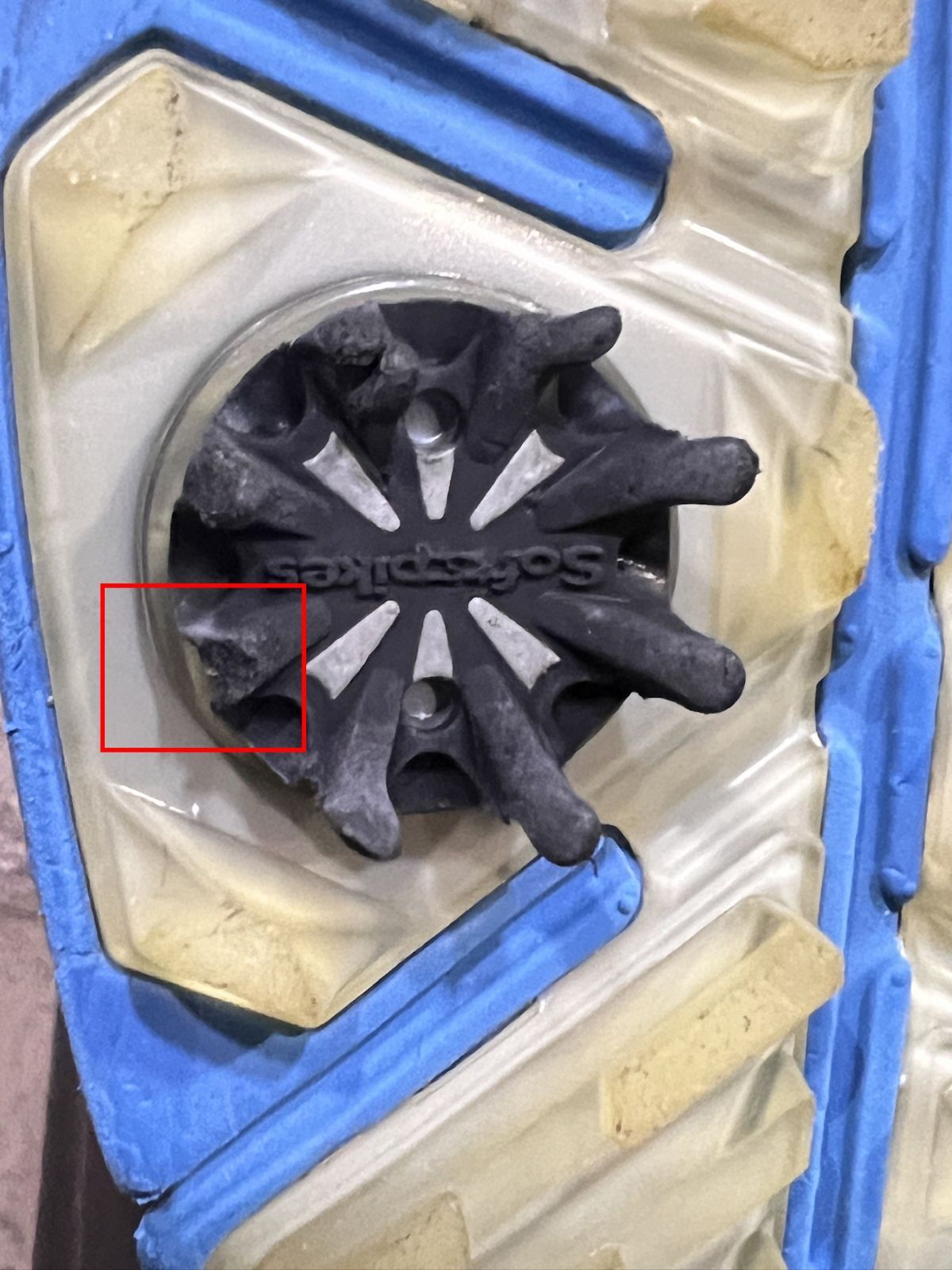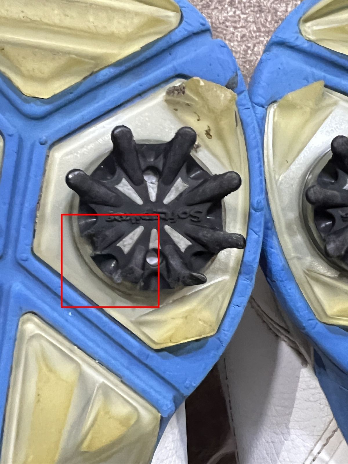 スパイクの鋲にいくつか欠けがございますが、このままでも使用は可能です。気になる方は交換してください。