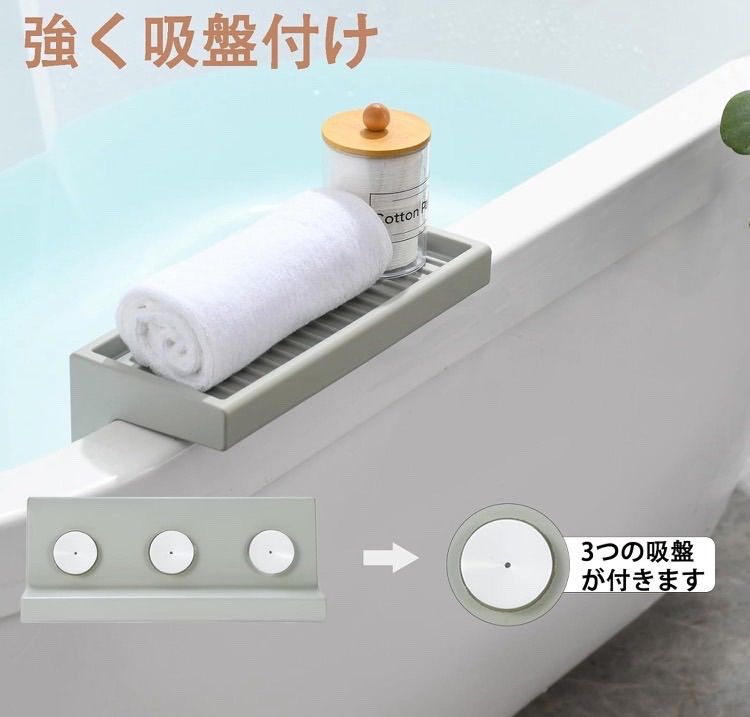 【強く吸盤付け】バスタブトレイの裏側に3つのサクションカップがあります。バスタブの端に取り付けるだけで、滑り落ちにくいです。しっかりと固定できるため、ずれにくいです。