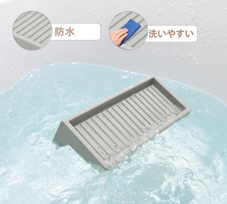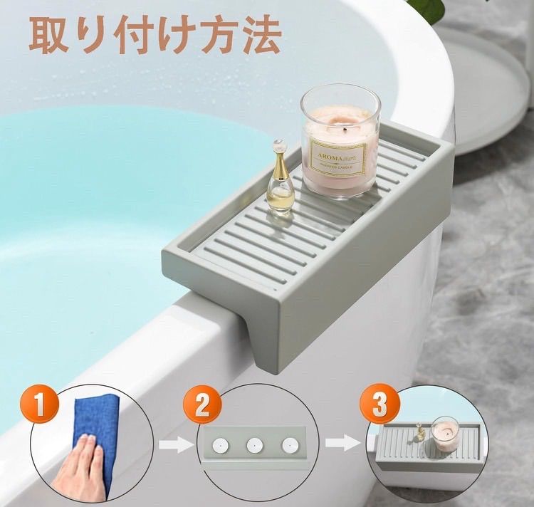 【簡単に取り付け】バスタブのフチにちょこんと乗せるだけで、吸盤を押して、中の空気を押し出すと、しっかりとくっつきます。使用後は、指先を吸盤のエッジからゆっくりと持ち上げてください。【注意事項】バスタブから取り外す際、バスピローの吸盤を無理に引っ張らないでください。本体を無理に引っ張ると吸盤が脱落する恐れがあります。浴室トレイを清潔に保つために、使用後は水で洗い流して拭き取ってください。