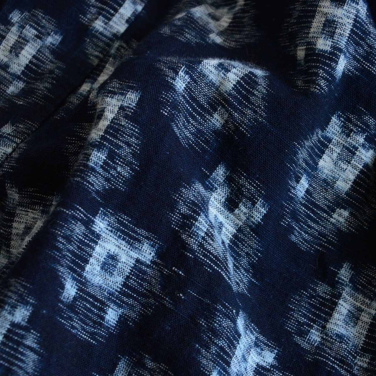 藍染絣のヴィンテージ野良着です。日本の農家の仕事着や日常着として使われてきたこの野良着は、丈夫で動きやすい木綿の古布を使用しており、使い込むほどに柔らかく味わい深くなるのが特徴です。藍染ならではの深い色合いや、絣の美しさ、古布としての魅力も存分に楽しめます。