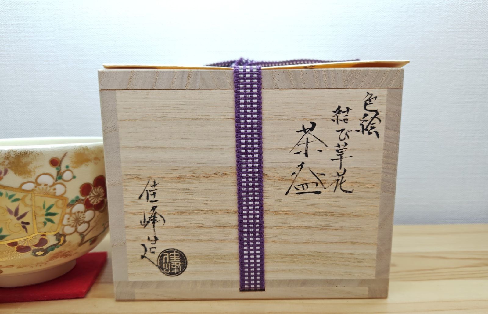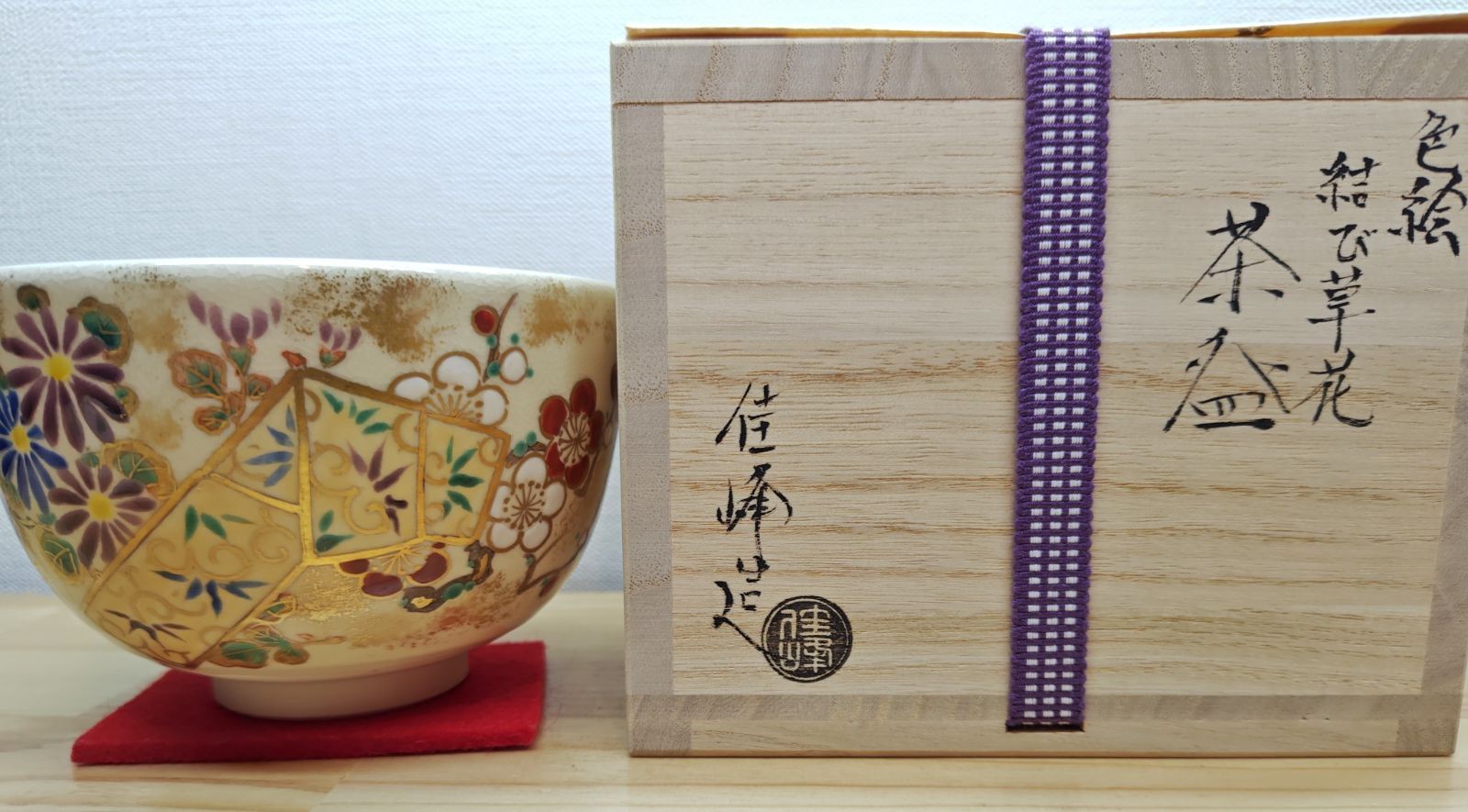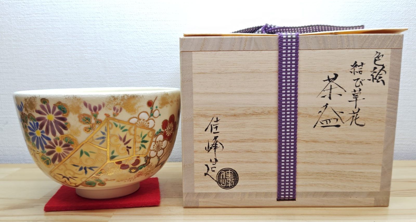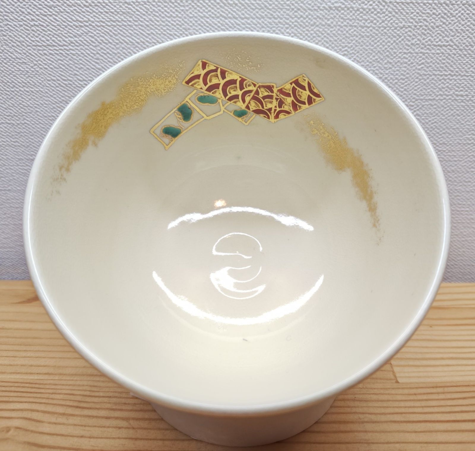 色絵のお茶碗で、結び熨斗と四季草花の絵付けのお茶碗になっています。